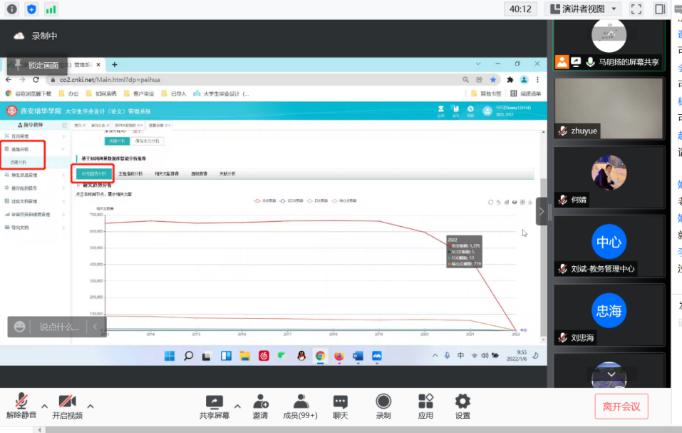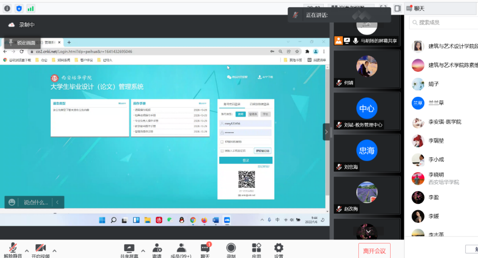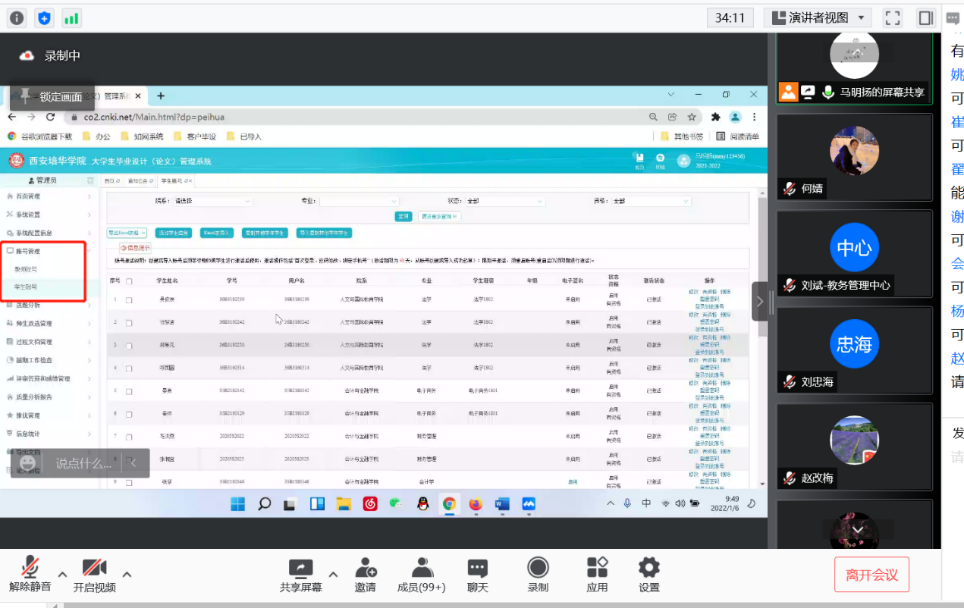 1月6日上午9:30,我校举办了2022届本科生毕设系统线上培训专题会。中国知网陕西省业务经理马明扬老师对各二级学院2022届毕业论文(设计)指导教师、教学干事等200余人进行了专题培训。会议由教务管理中心刘斌副主任主持。