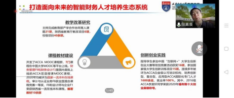 会议首先由主嘉宾西安交通大学博士生导师、管理学院副院长田高良教授主讲《数智时代复合型管理会计创新人才培养探究》,田教授是教育部会计学专业教指委委员、财政部管理会计咨询专家、陕西省工商管理类教指委主任委员、全国会计学术类领军人才,他分享的打造面向未来的智能财务人才培养生态系统令听者思路顿开、受益匪浅,田教授指出,从科技、专业、生态、机制四个维度赋能产教融合,打造多主体协同育人的长效机制,构建产教融合、校企合作的良好生态,形成良性循环的机制:政府搭台、企业支持、高校对接、共建共享,这样能够有效激发各方的积极性和创新活力,有力推动高校人才培养模式变革,为培育一批创新型、复合型、应用型高素质的国际化智能财务人才搭建平台。