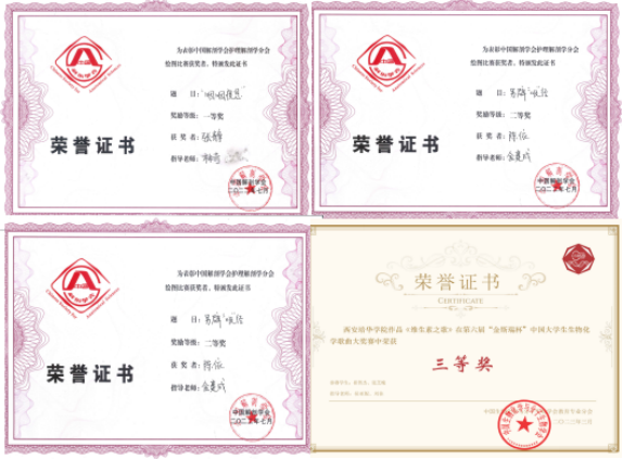 陕西省首届“国希望云解剖”人体解剖学知识竞赛本科组一等奖一名、二等奖四名、三等奖三名,高职组一等奖一名、二等奖两名、三等奖三名,高职组荣获集体特别奖;第六届“金斯瑞杯”中国大学生生物化学歌曲大奖赛三等奖一项。