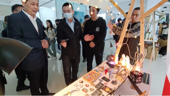 创客中心王旭东老师向长安区委书记吕强介绍我校创意市集展位