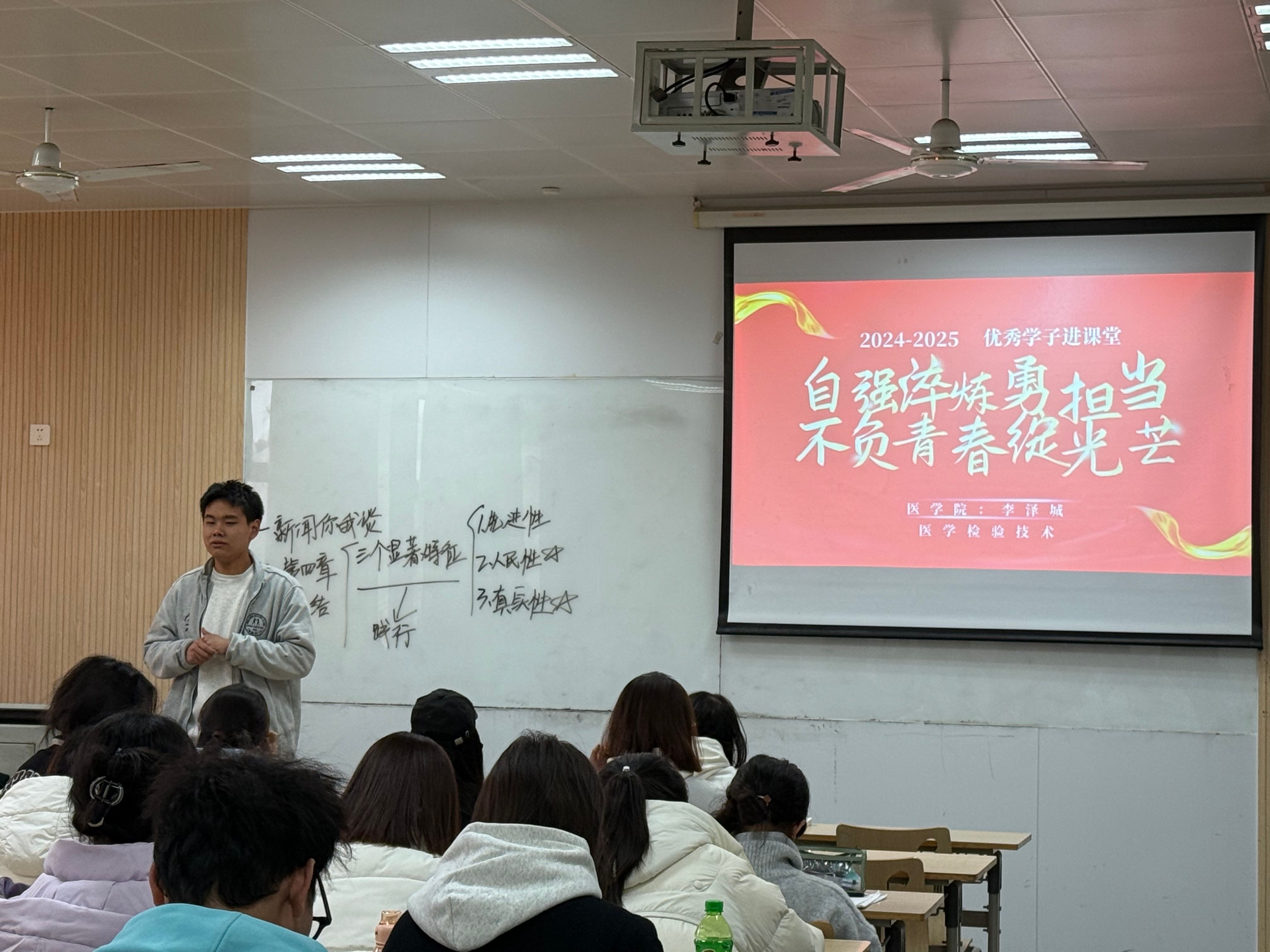 为落实立德树人根本任务,进一步加强学风建设,切实引导广大学生树立正确的成才观,充分发挥榜样的力量,11月21日,我校教务管理中心英才办联合马克思主义学院举办优秀学子进课堂活动,邀请体育学院2021级学生高浩博、传媒与设计学院2022级学生陈静怡、医学院2021级学生李泽城三名国家奖学金候选人分别进入其所在学院2024级英才班学子们分享自己的学习、学科竞赛、科研、实践等经历经验。