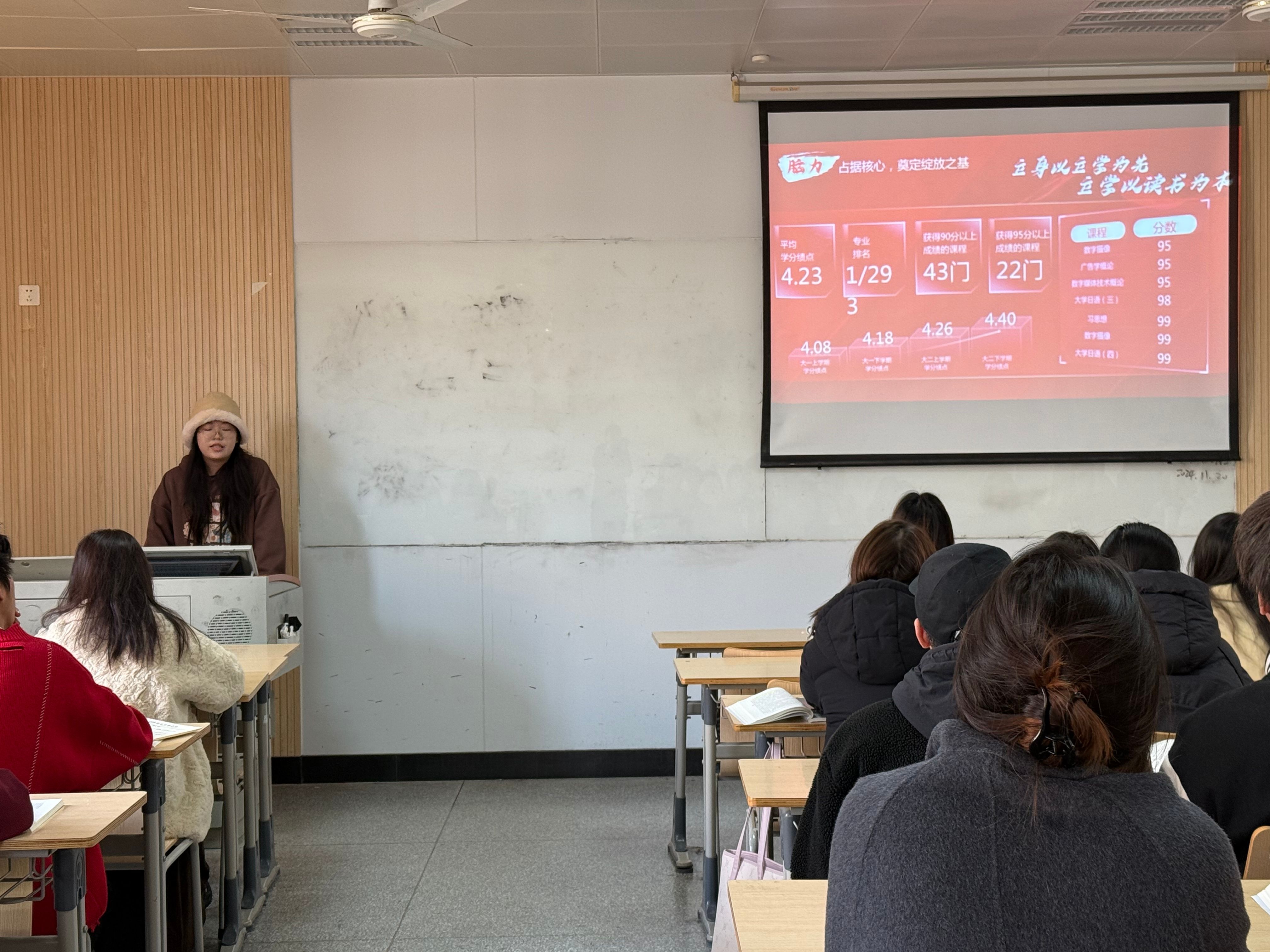 传媒与设计学院国家奖学金候选人陈静怡同学为学弟学妹们进行了题为“多少新闻事,应须语到明”的分享。