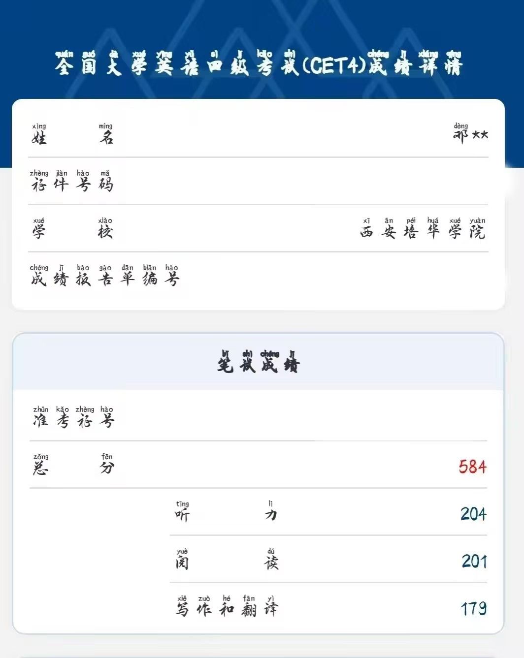 近日,2024级“英才培育”计划学生在2024年12月大学英语四级考试中取得了令人瞩目的成绩。报考的102名英才生中有83人通过四级考试,通过率高达81.37%,此次考试中,高分段学生表现尤为突出。500分以上的学生有31人,其中,基础英语拓展2班法学专业邓盈莉同学取得了584分的高分,基础英语拓展4班班计算机科学与技术专业的李璐瑶同学取得了575分的优异成绩。