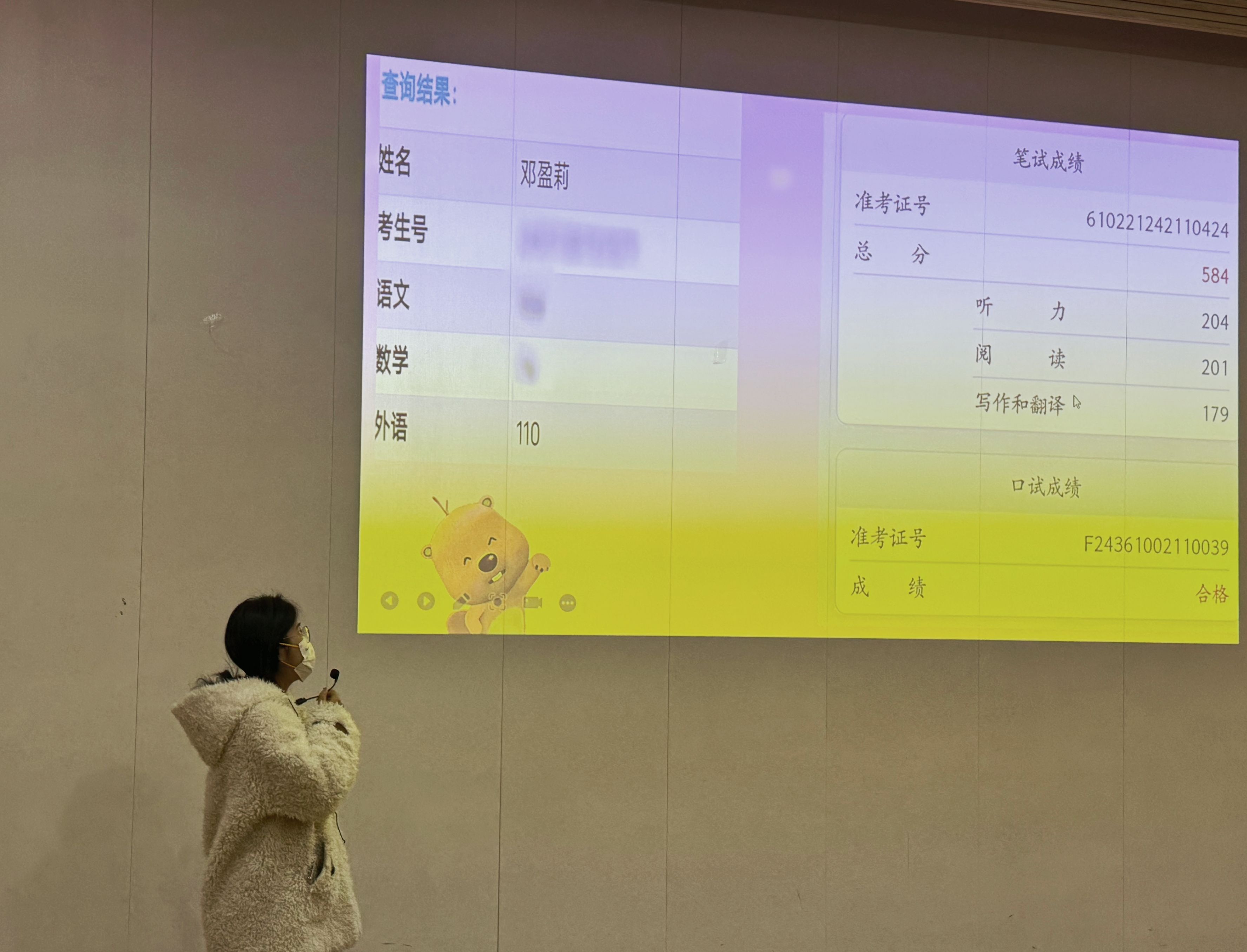 法学院于3月2日开了2024级“英才培育”计划学生的四级考试经验分享会,四级高分通过邓盈莉同学首先展示了自己的高考英语成绩和四级成绩,用数据说话,打破了“高考成绩决定四级上限”的固有观念,激励同学们只要努力学习,就一定能在四级考试中取得优异成绩。