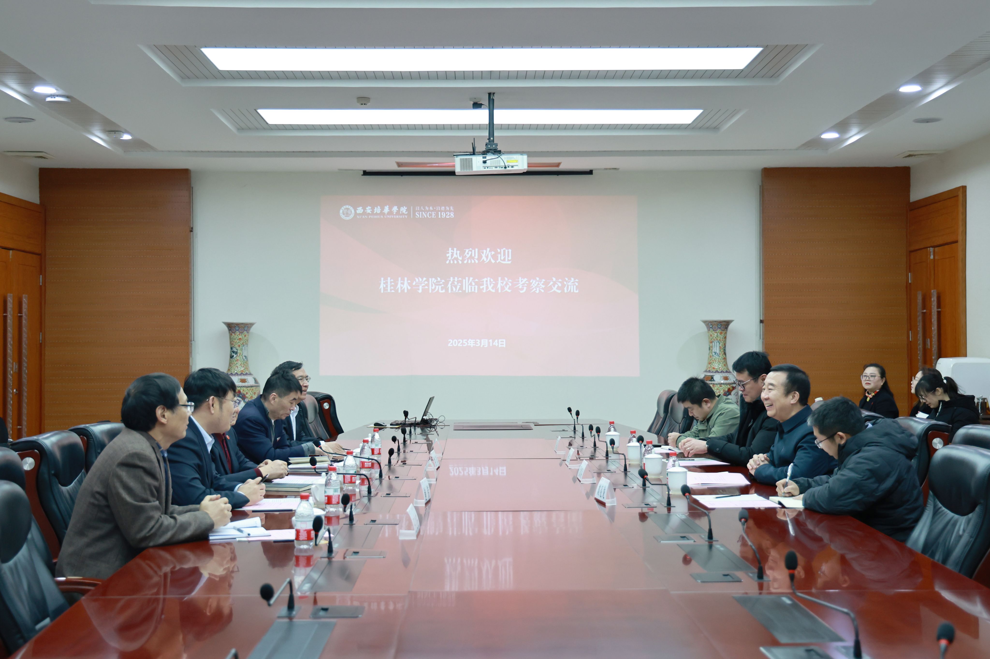 3月14日下午,桂林学院校长、党委副书记吴郭泉一行来校进行考察交流。桂林学院产教融合与创新创业中心主任、教务处常务副处长杨杰夫,桂林学院理工学院院长、网络与信息化处处长李红波,理工学院副院长刘亮龙,理工学院电子信息工程教研室主任朱新波,西安培华学院校长李映方,教务管理中心主任铁卫,智能科学与工程学院院长王文庆、电子系主任徐进参与座谈会。会议由校长助理鲍伟主持。