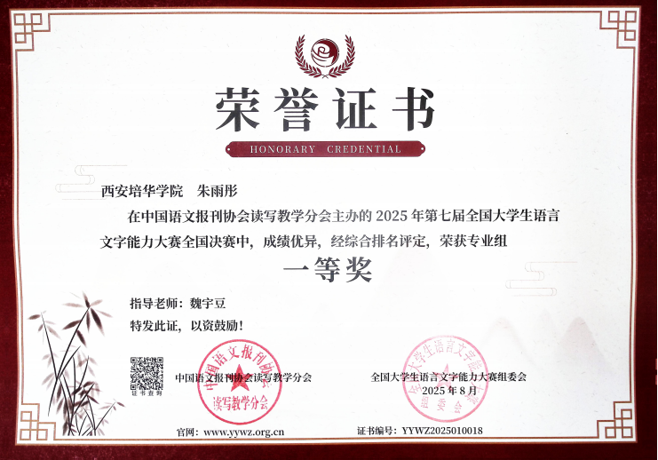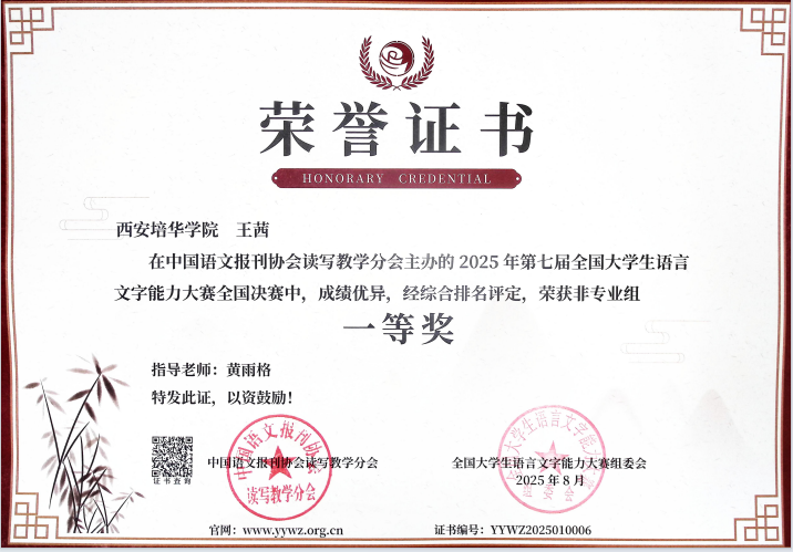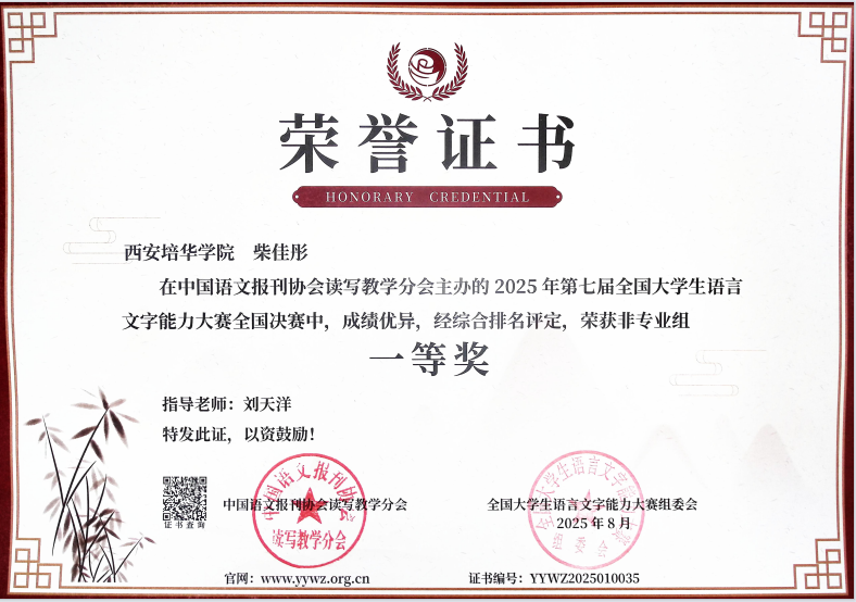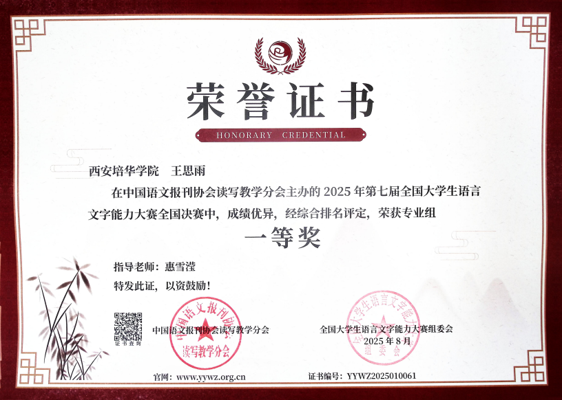 全国大学生语言文字能力大赛是由中国语文报刊协会读写教学分会主办的国家级赛事,旨在贯彻落实国家语言文字事业发展规划,提升大学生语言文字应用能力。“语言文字是文化传承的载体,也是人才核心素养的重要组成部分。”西安培华学院此次佳绩的取得,不仅是对学校语言文字教育工作的肯定,更彰显了其在推动区域文化传承与高等教育内涵式发展中的积极作为。西安培华学院将以本届赛事成果为契机,持续深化语言文字教育改革,进一步完善“以赛促教、以赛促学、以赛促改”机制,为培养兼具人文素养与实践能力的新时代大学生奠定坚实基础。