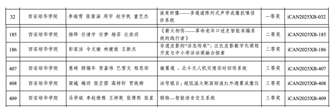 获奖项目中,由创客中心王旭东老师指导、李瑞雪等同学完成的《波束析像---多通道阵列式声学成像抗噪侦诊系统》获一等奖并晋级国赛;马克思主义学院薛舒凡老师指导的《薪火相传---革命老兵口述史智能采编系统的践行者》(杨烨等学生团队)、传媒与设计学院张甜老师指导的《非遗皮影的“活态传承”:汪氏皮影数字化课程开发与中小学活动课融合探索》(彭家洁等学生团队)分获二等奖;智能科学与工程学院师生团队的《璇翼通----北斗无人机灾情实时回传系统》、《冰穹锐目:超低温大靶面短波红外透雾成像仪》、《颐聆---智能语音交互系统》荣获三等奖。