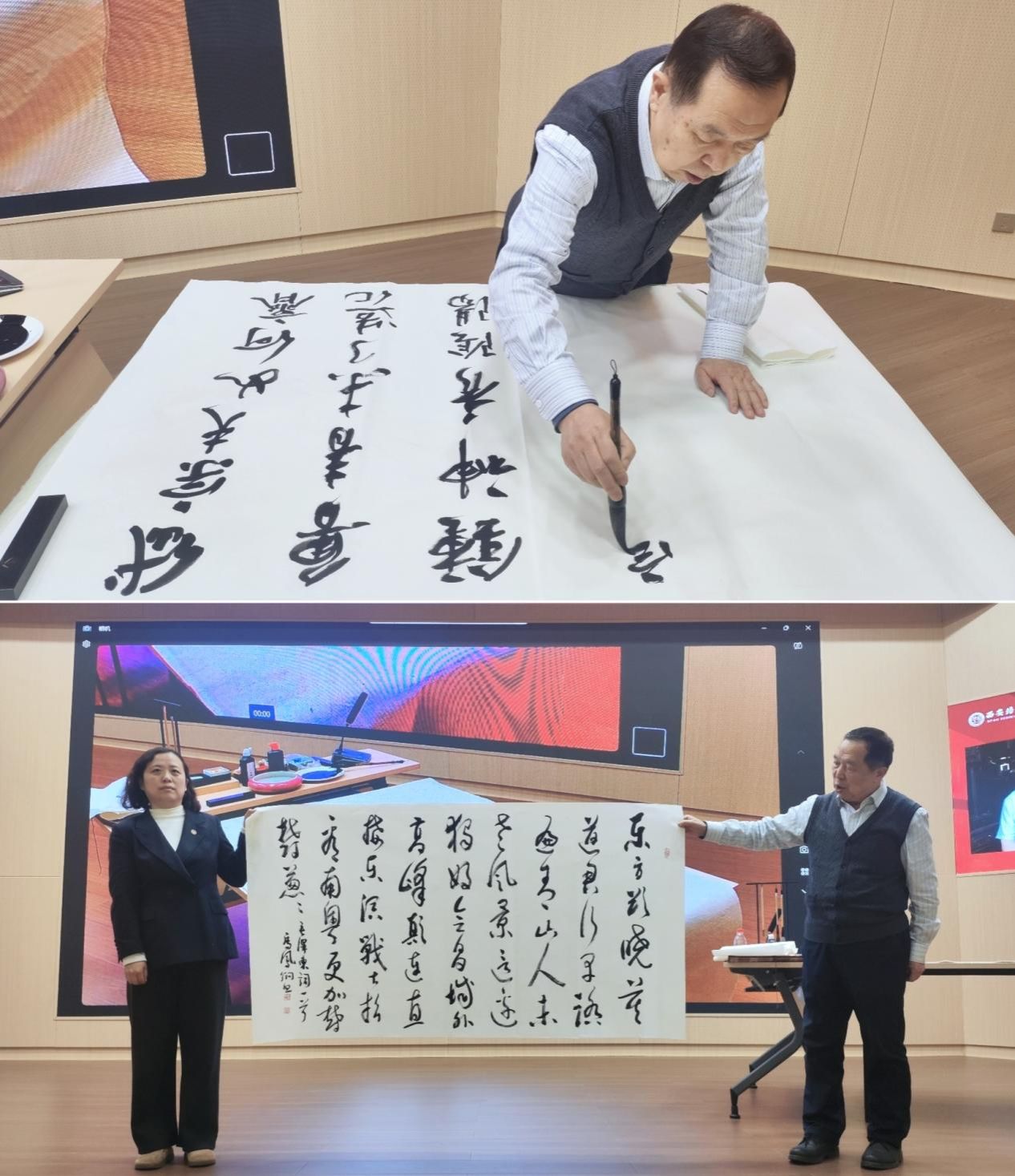 书法展示环节,马教授现场泼墨挥毫,向大家展示了精湛的书法技艺,他书写的作品赢得了与会人员的阵阵掌声。同时他还建议同学们一定要分阶段对自己进行合理规划,培养不同的兴趣爱好,提升自己的综合能力。与会师生纷纷表示,本次讲座内容系统而实用,为他们今后的书法学习指明了方向,期待今后可以参与更多此类深度文化活动,共同感受中华优秀传统文化的永恒魅力。