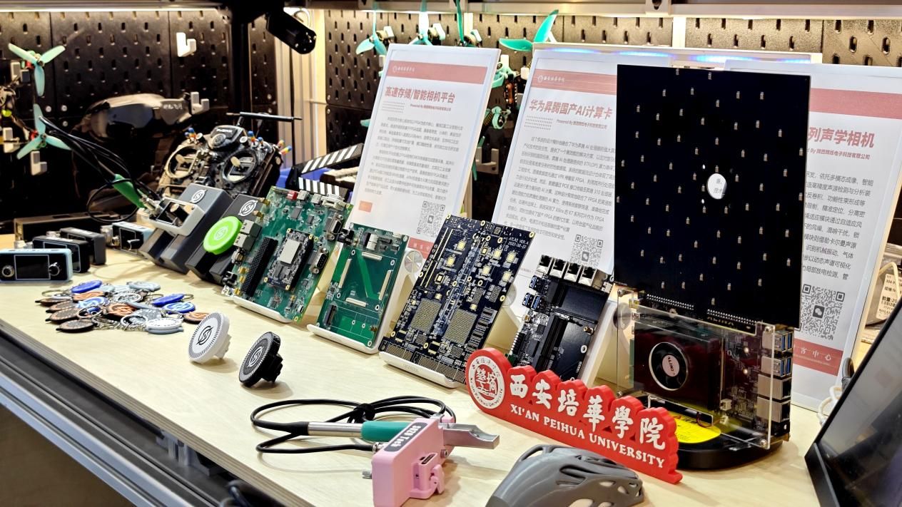 展会现场,我校团队以实物展示、功能演示、技术解读等互动形式,全面展示创新成果,吸引多家企业和机构驻足咨询、洽谈合作,意向对接氛围浓厚;“5寸穿越机整机系统” 成功入选以 “货架+标签+推介” 模式打造的核心展区——“高校成果超市区”, 成为陕西省民办高校中科技成果跻身核心展示区的代表之一。