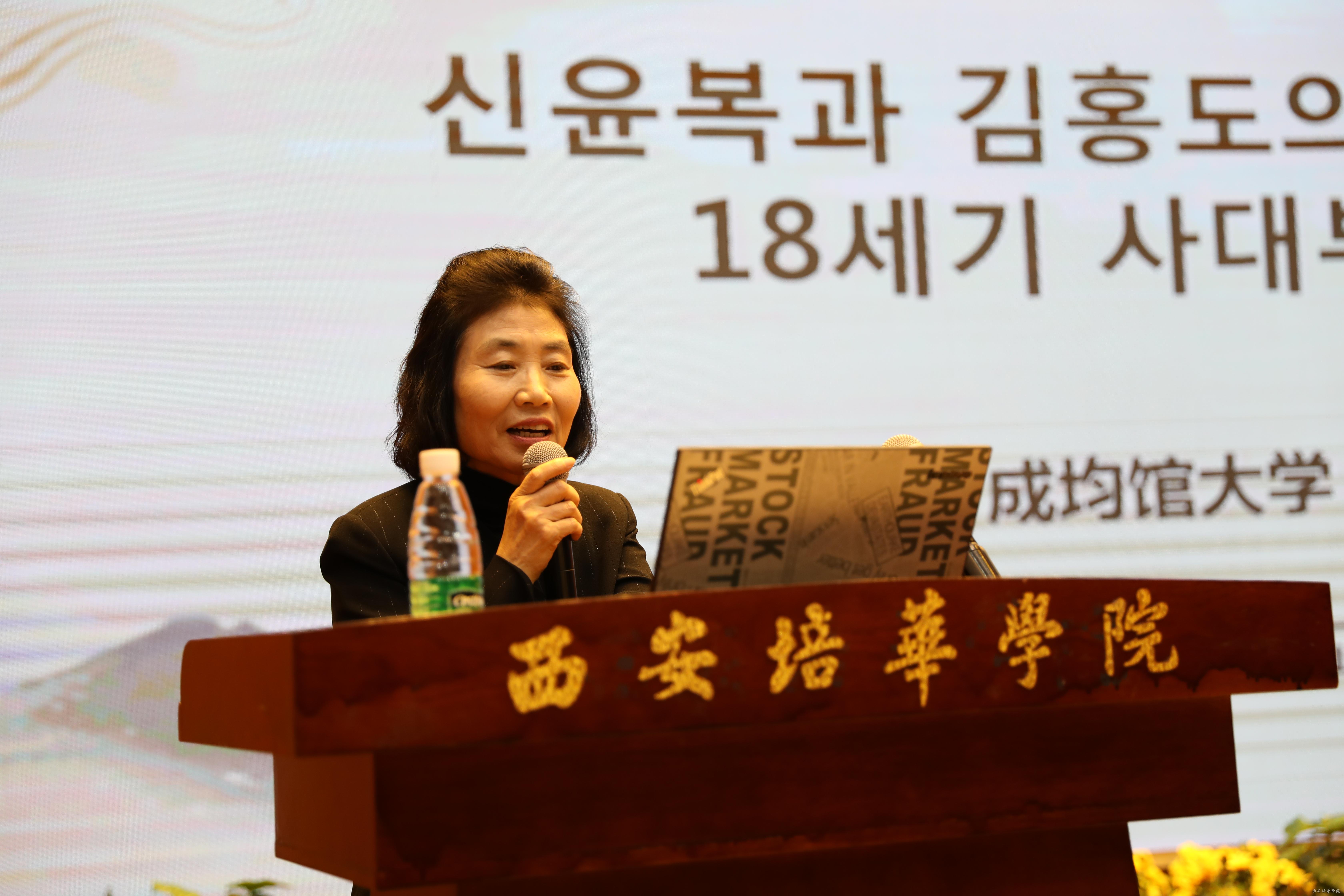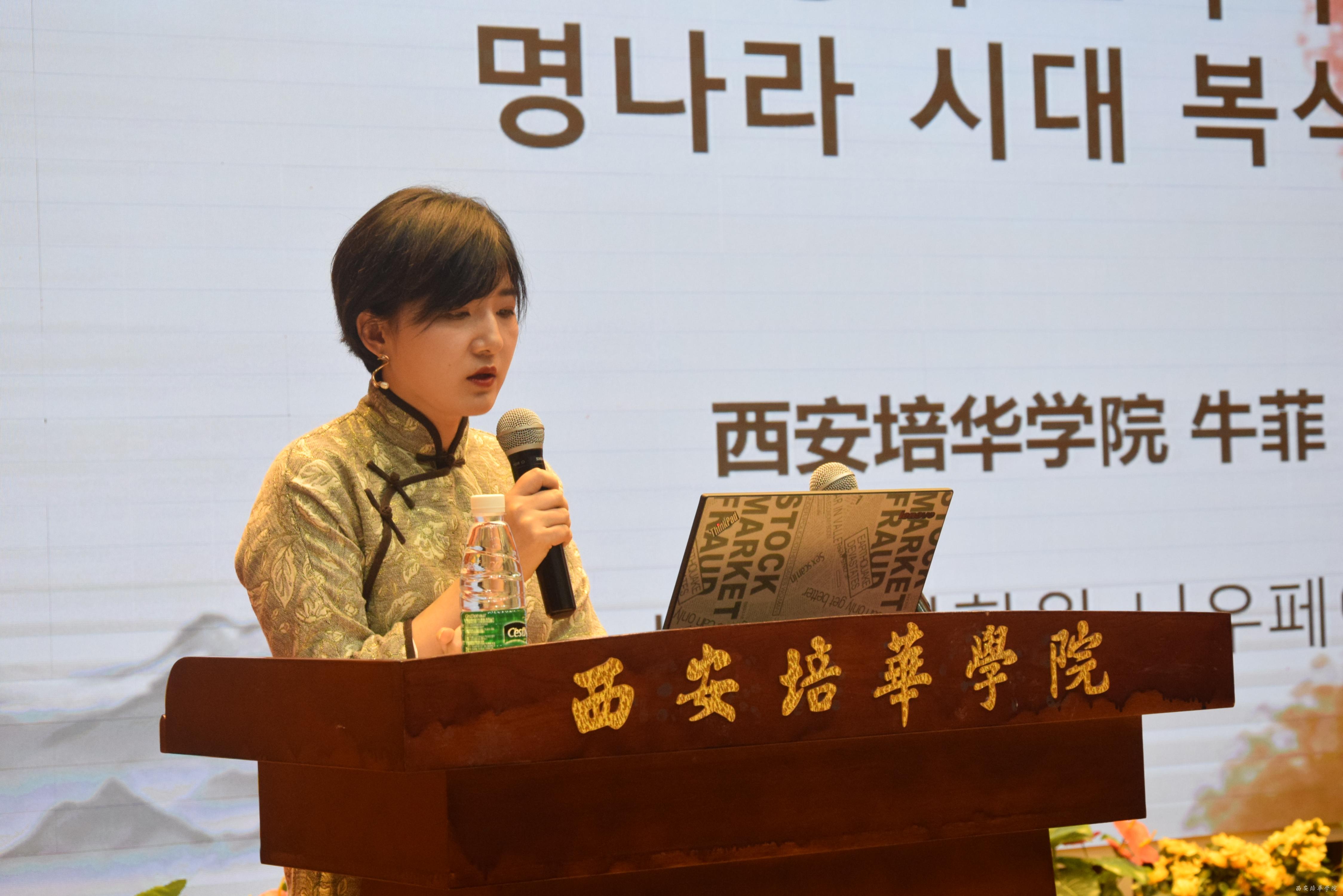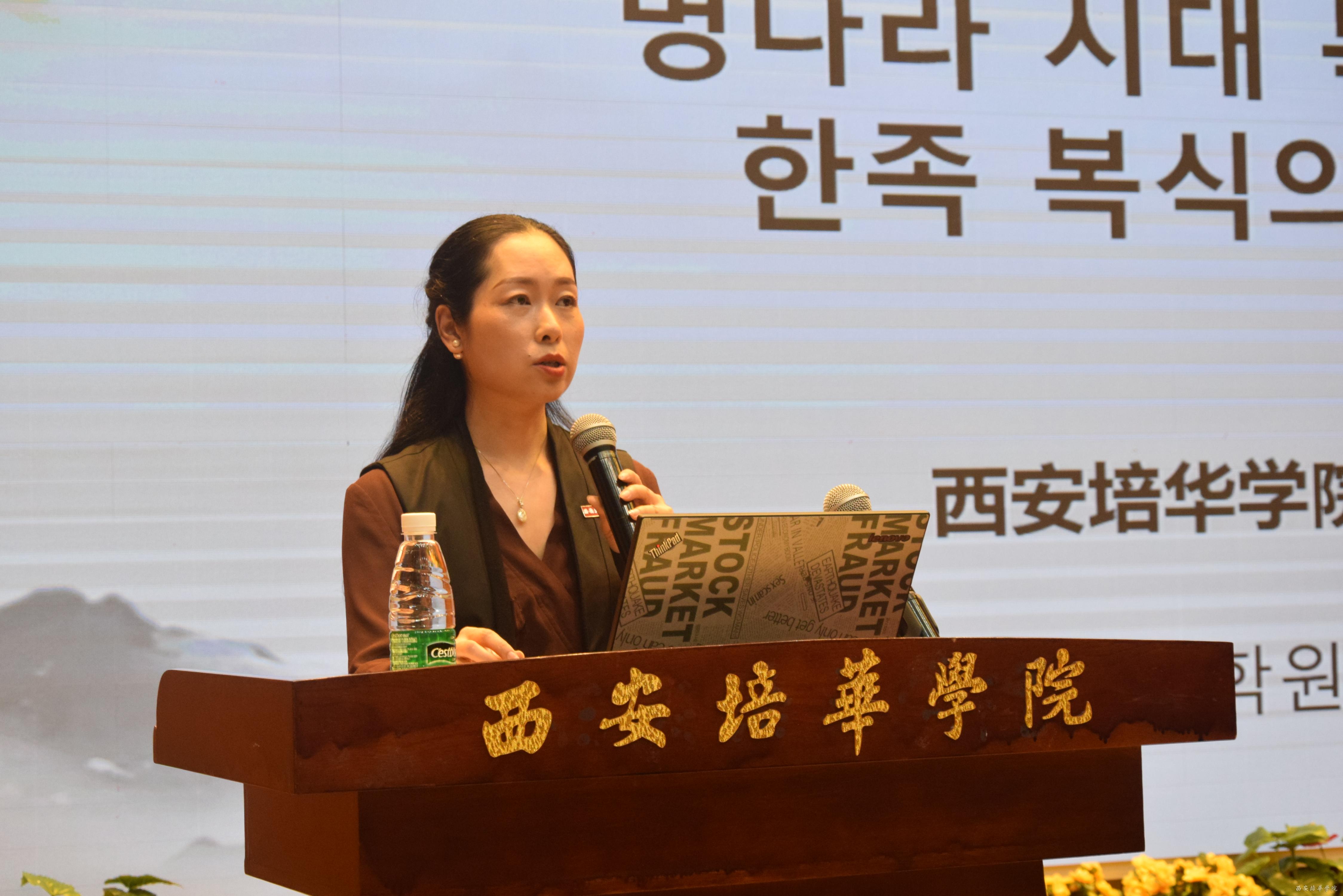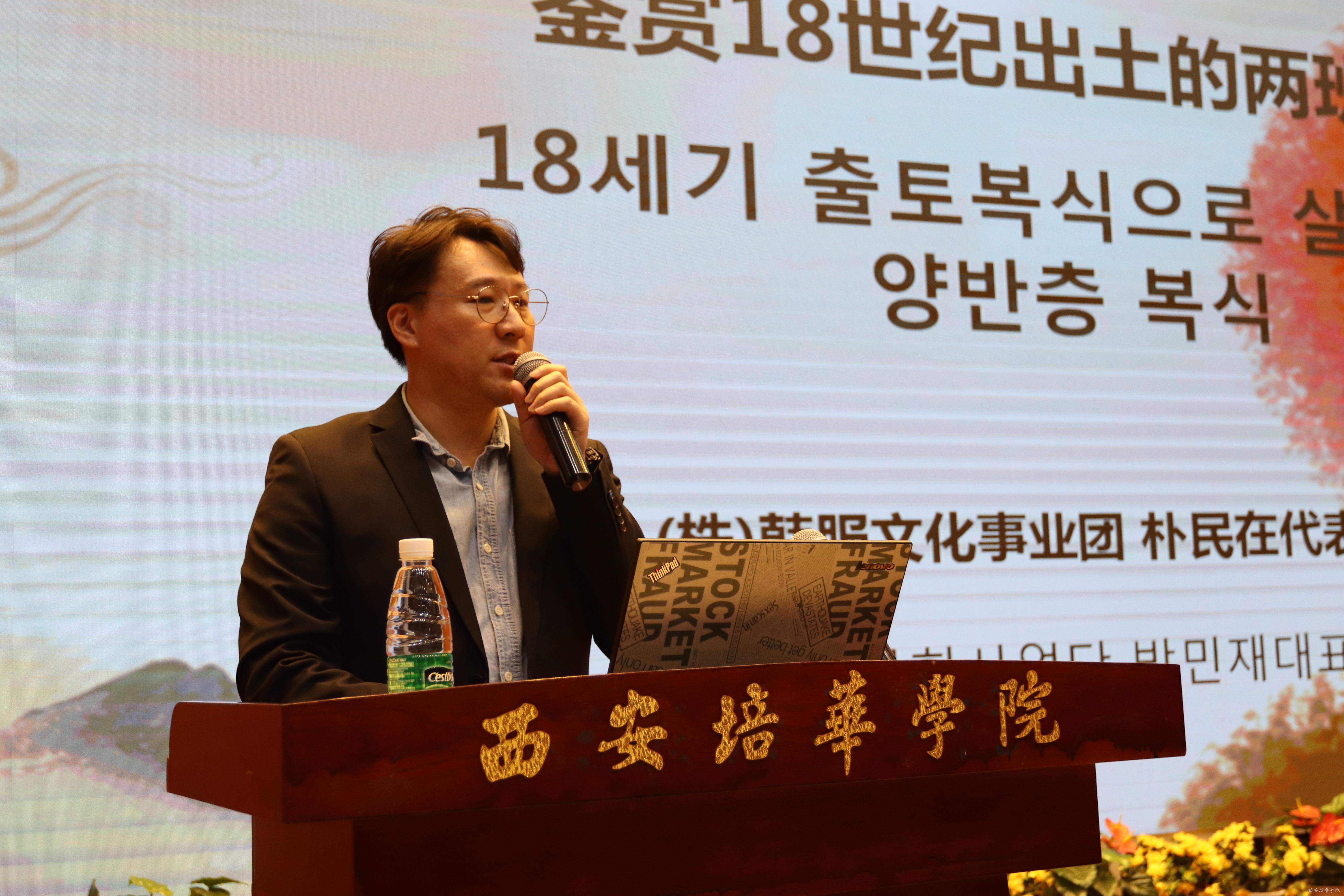 在随后进行的专家主题宣讲环节,韩服文化事业团朴民在代表作了以“鉴赏18世纪出土的两班服饰”为主题的报告。韩国成均馆大学赵又玄教授作了以“申润福和金洪道的风俗画-18世纪士大夫和妓女服饰”为主题的报告。西安培华学院李媛教授作了以“明朝时期服饰特点-汉族服饰的艳丽余晖”为主题的报告。西安培华学院牛菲教授作了以“明代传统服饰形象在当代影视剧中的再造研究”为主题的报告。专家教授们通过图片解析、实物展示等方式,从不同角度入手,全面深刻解析了不同历史时期传统服饰特点,带领在场观众充分领悟中韩传统服饰的魅力。