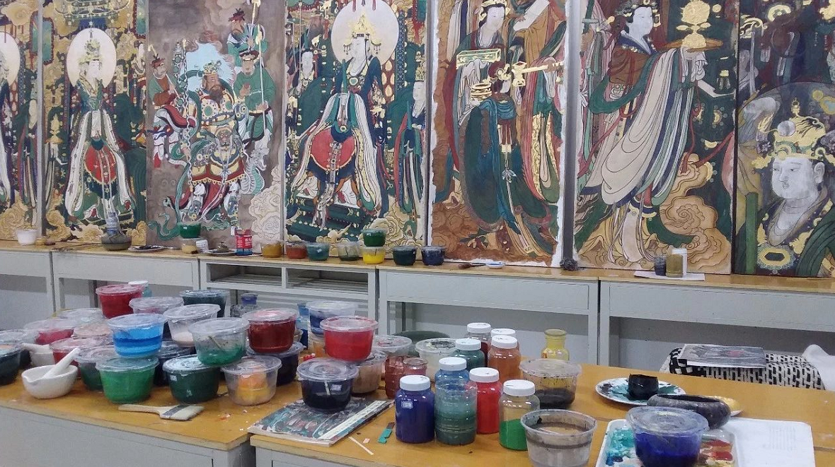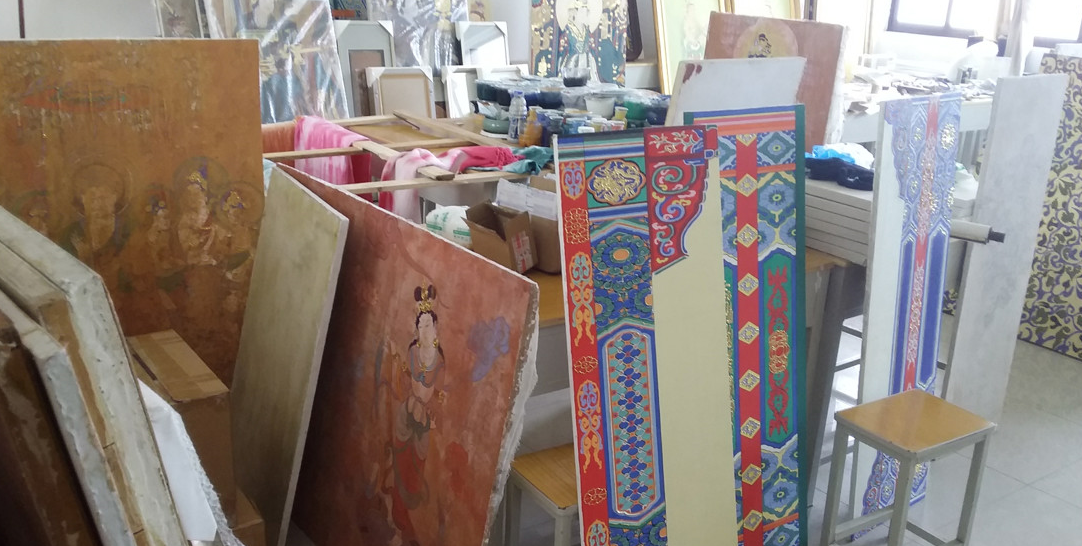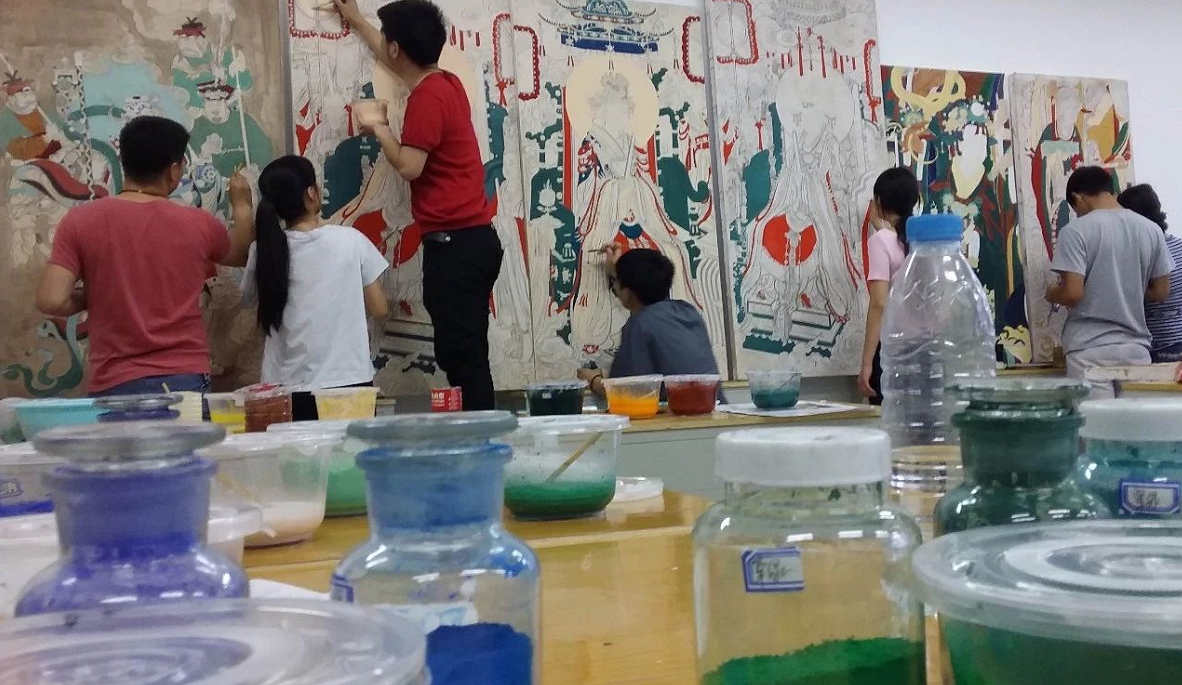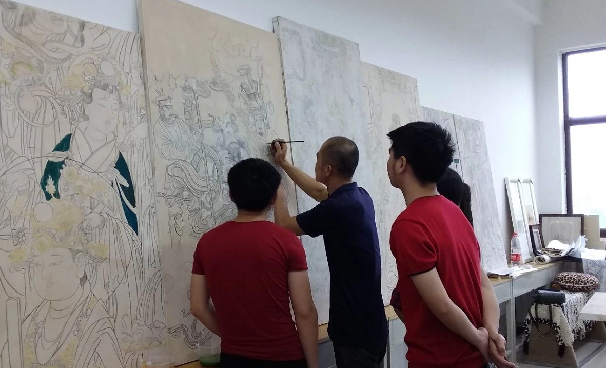 工作室教学围绕专业课程进行,壁画设计课为专业拓展课程,以学生自主选择性学习为主,目的在于学习姊妹艺术,提升文化素养。学习内容包括传统壁画和现代壁画两个部分,在工作室完成。