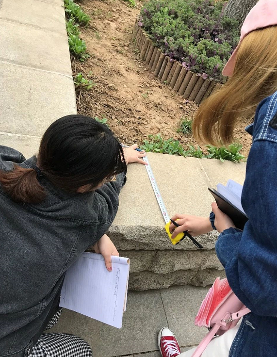 活动中,我们通过老师的讲解对公园的布置有了一定的了解。其中包括植物的分类及学名、道路的遍布与宽度、石凳的高度及测量的方法等。