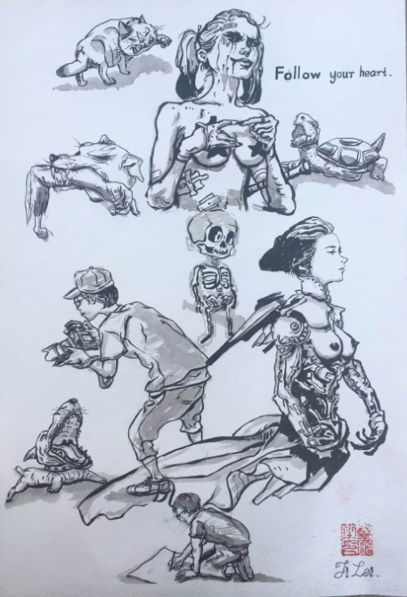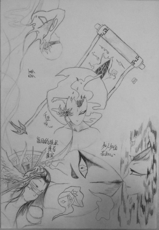 作品简介:这幅作品是表达我在入学几个月中出现的问题,画面最底部是我自己,上面摄影的人物也是自己的原型,旁边的恶犬是外界对我的争议,身旁的机械天使是表达了我的被动,小骷髅表达了此后我孤独、空的状态,最上方的小丑女是我后来的改变,自由、独断、个性。不被外界所干扰,做自己。