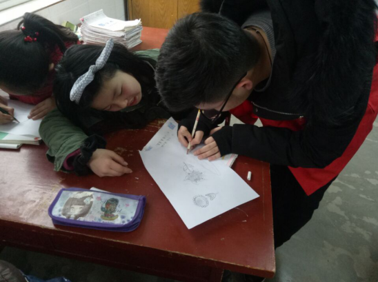 2017年12月14日下午,艺术设计学院青年志愿者协会会长沈婧、李兆阳带领视觉传达1701班的志愿者们前往长安区皇甫小学进行美术支教,并在四年级和五年级开展课程。