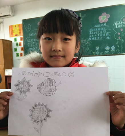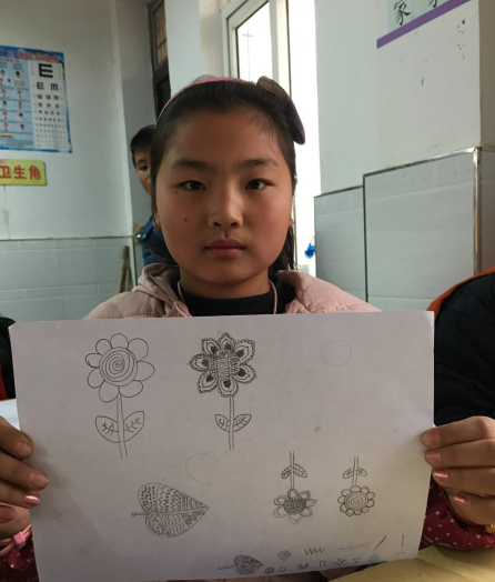 刚到学校正值课间,小朋友们的笑容感染了每一位志愿者。上课之前我们认真的思考着早已准备好的课程内容,希望给他们带去生动、有趣的美术课程。此次支教内容主要为:教小朋友们认识不同的线性花纹,在所画的植物以及花草里进行内容填充,使画面更加丰富多彩。