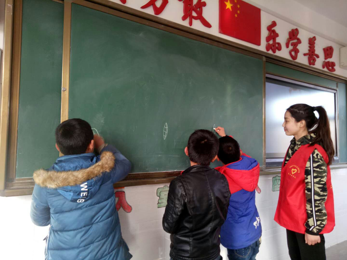 穿上志愿者红马甲的志愿者们,站在讲台上面对下面一双双五黑发亮的大眼睛,真切的 感受到了作为一位老师的感觉,情不自禁的认真与负责,情不自禁的热爱与深刻。能够作为他们的老师,是我们的幸运。