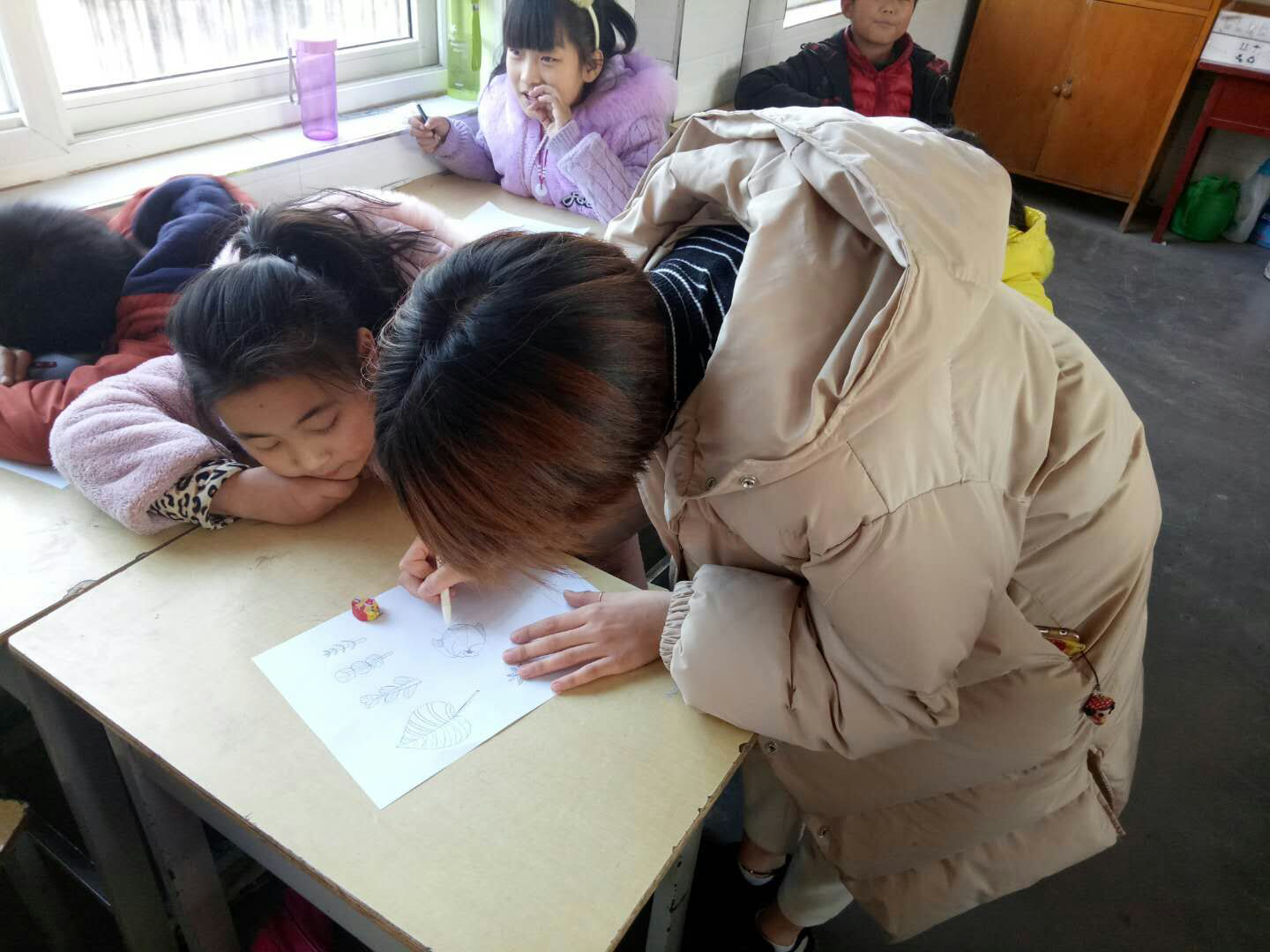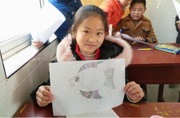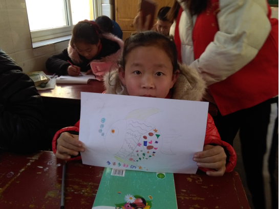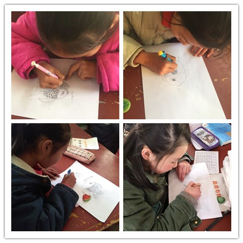在上课过程中志愿者针对每个小朋友的情况,逐一进行辅导,在他们不理解、不会画的地方给予帮助,建立小朋友的自信心。
