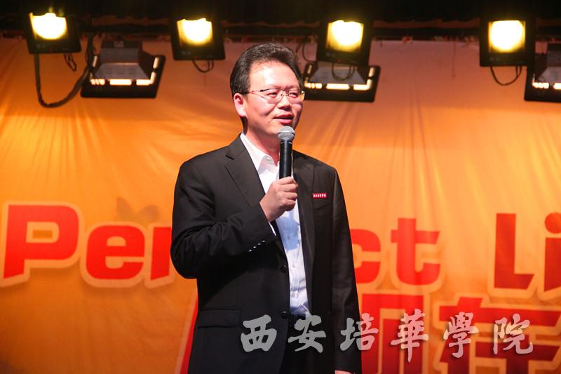 在会上姜波理事长还发表了重要讲话。首先,他对我院举办的此次迎新晚会给予了极大的肯定和很高的评价并对我院全体大一新生的到来表示热烈的欢迎。之后他强调,人文与艺术学院是一个多元化的集体,院领导班子充满了活力和希望。每年一次的迎新晚会似乎已经成为了一种文化,总有很大惊喜出现也总能给人留下一些美好的回忆。现在大一学生在培华的这段时间里已经有了一定的感受,相信随着以后的生活同学们还将会有更多的、美好的感受和回忆,也希望大家能够在培华这个大家庭里不断的发展自己提高自己,使自己有一个美好的未来。最后,姜波理事长给大家清唱了一首粤语版的《沉默是金》,真是将现场气氛调动到了顶峰,台下掌声雷动。