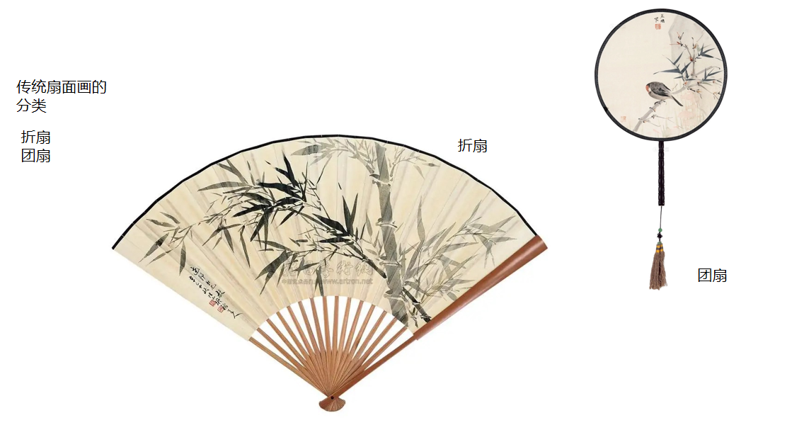 在中国画门类中,历代书画家都喜欢在扇面上绘画或书写以抒情达意,或为他人收藏或赠友人以诗留念。存字和画的扇子,保持原样的叫成扇,为便于收藏而装裱成册页的习称扇面。从形制上分,又有圆形的团扇(织扇)和折叠式的折扇。