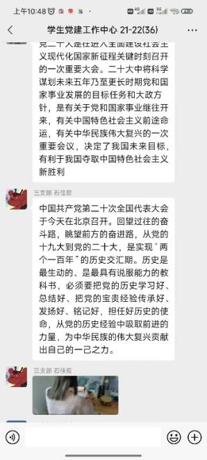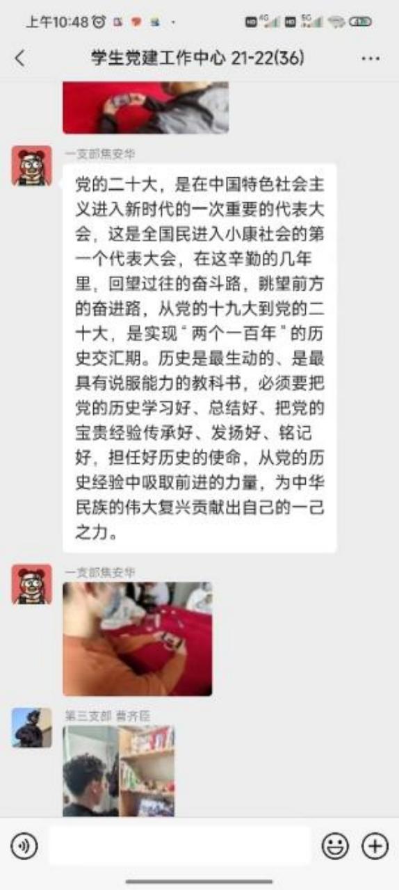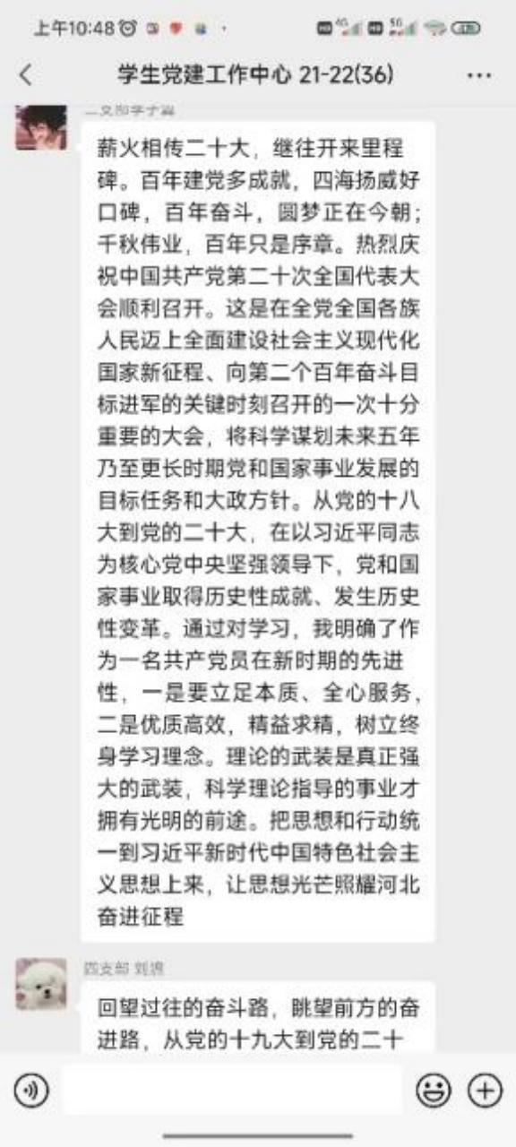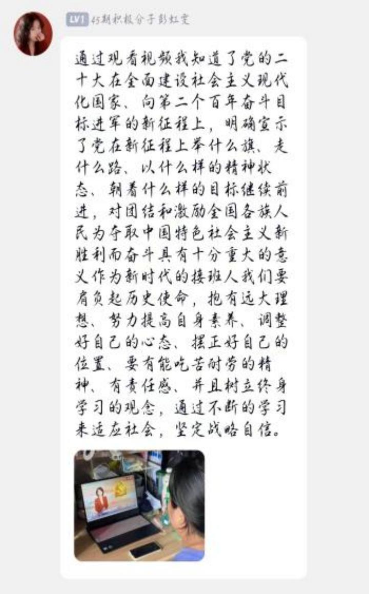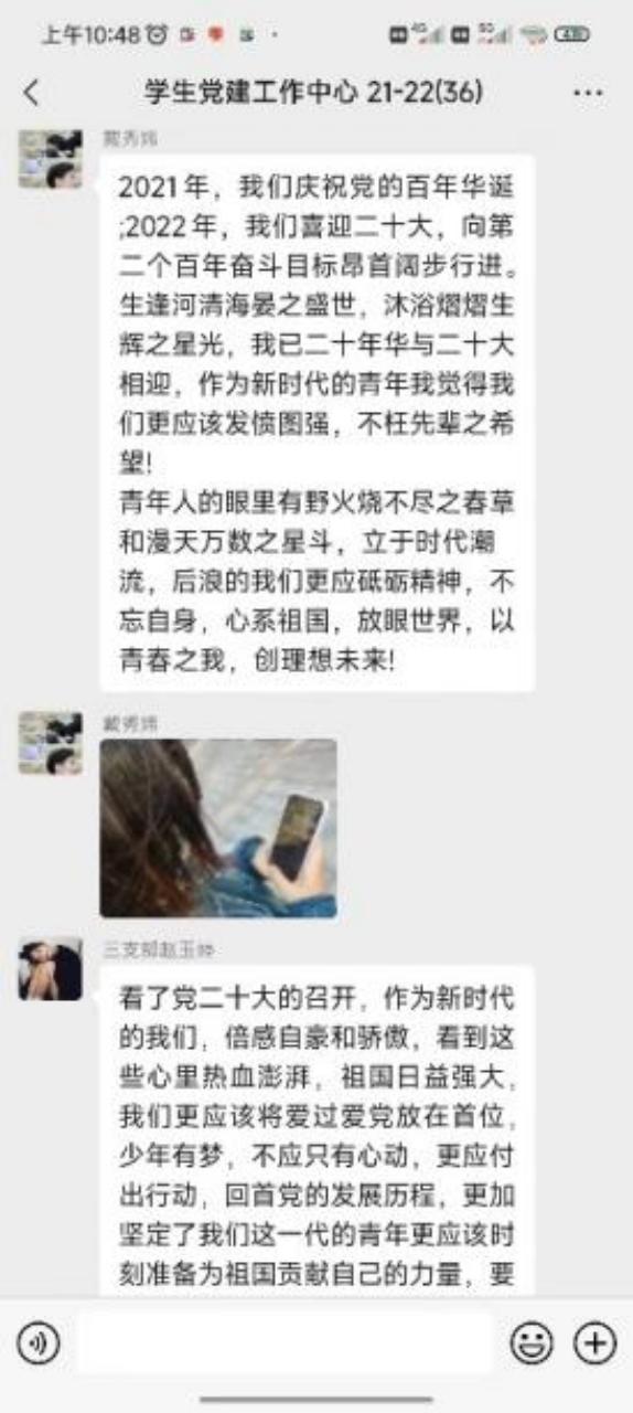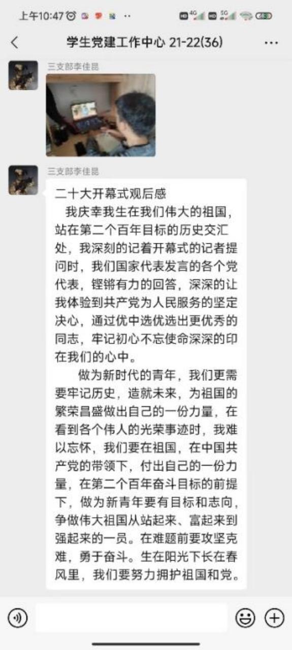 今天我们迎来了党的二十大的召开,我们再一次领略到了中国共产党的风采,民族自豪感再一次油然而生,时代的发展,科技的进步,在中国共产党的领导下,我们的祖国越来越强大,身为中国共产党的接班人的我们,应该肩负起责任,要时刻谨记共产党的思想理念,严格要求自己,秉承“人民有信仰,民族有希望,国家有力量”的信念,坚定不移的跟党走。