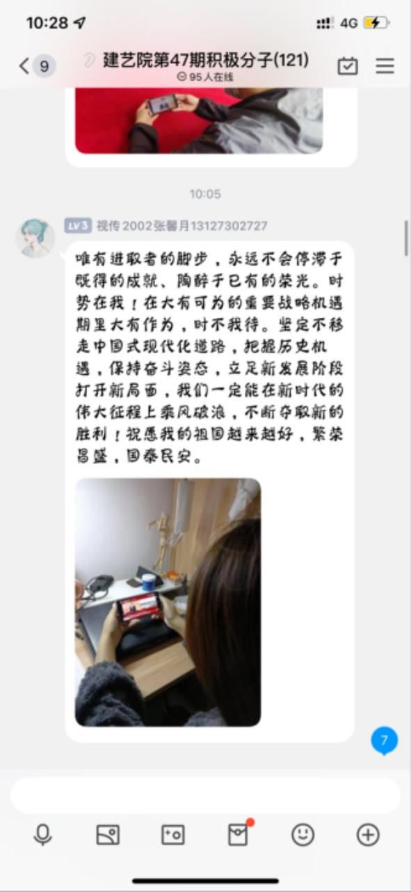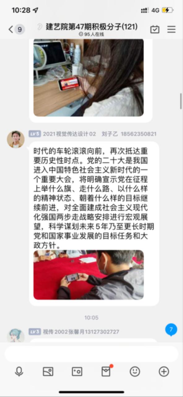 今天,中国共产党第二十次全国代表大会开幕。作为新时代的接班人,我信心满怀向未来,不断以实际行动喜迎党的二十大胜利召开。我们更要以服务社会、建设社会为目的,时刻以一名合格的共产党员的标准要求自己。青年人蕴含着巨大的能量,但需要正确的领导和指引,正是在党的坚强领导下,我们青年才能勇立潮头。我们要凝聚力量,同心同德,在新时代新征程中做最好的自己!