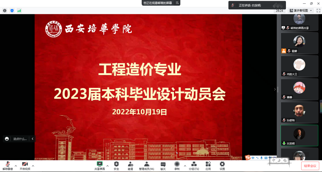 出席本次会议的有工程造价专业带头人白发明老师、工程造价系系主任杨锦老师、工程造价系系副主任郗茸老师、其他毕业设计指导教师及工程造价2023届全体毕业生。