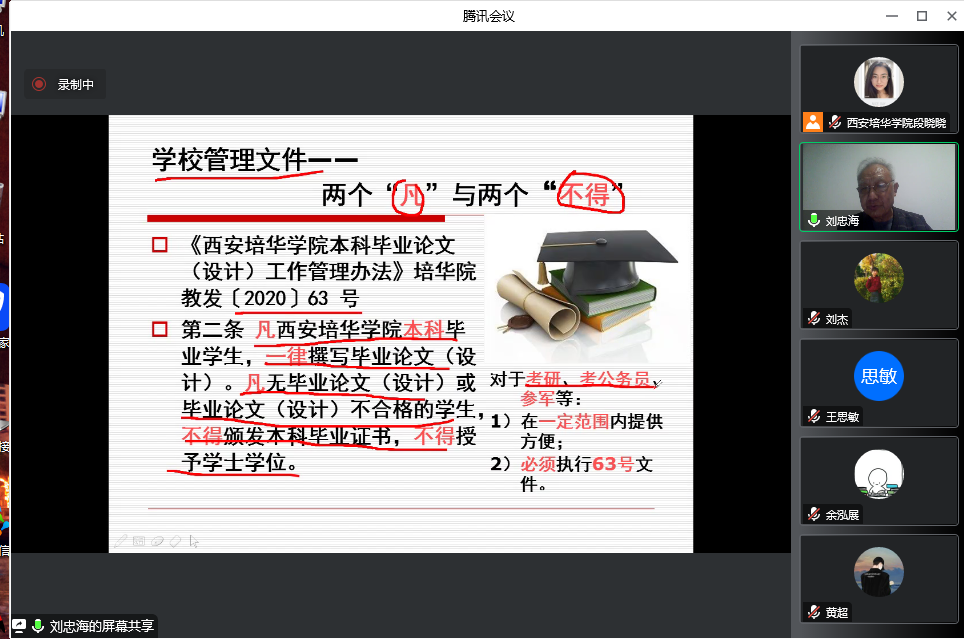 其次,刘老师从毕业设计题目的拟定、任务书的撰写、开题报告的撰写等方面给出详细的指导。刘老师向同学们详细介绍了毕业设计的流程与时间安排、论文的书写格式、开题答辩的规则及时间等。希望同学们按照要求进行设计、认真画图,严格遵守毕业设计的格式和标准,并且及时与指导老师进行沟通,为毕业设计中期检查、评阅及论文答辩做好准备。