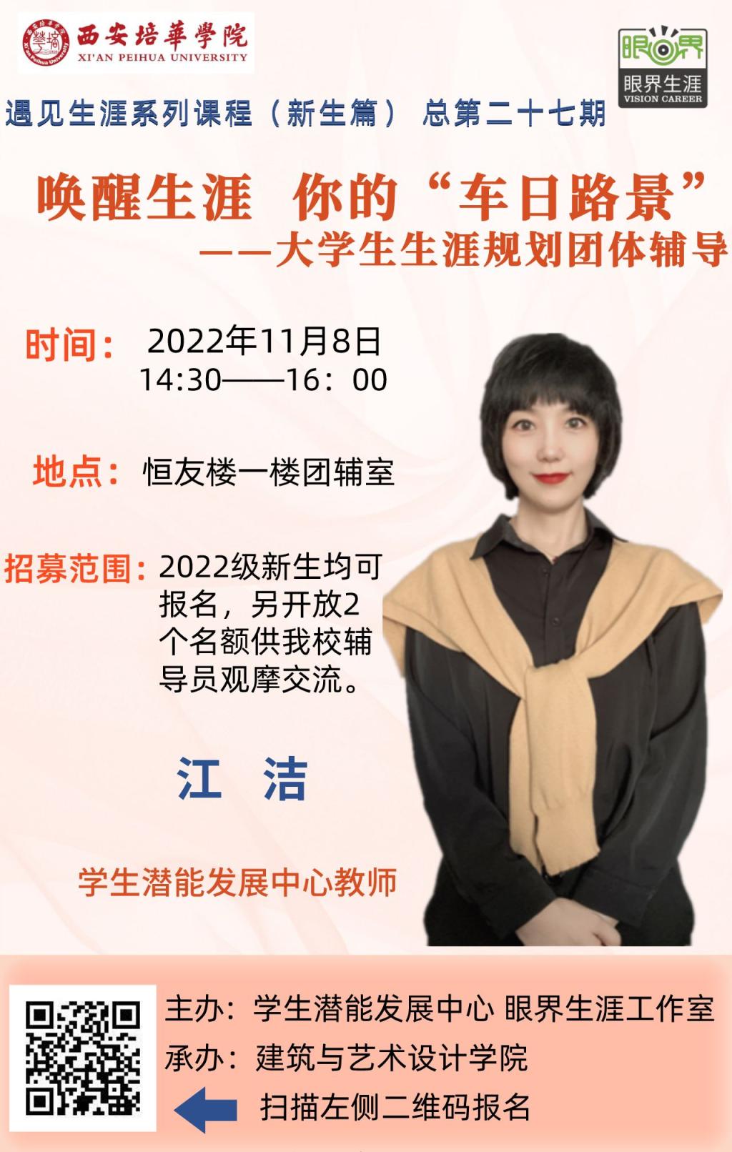 为帮助我院2022级新生正确地认识自我、了解自我、发现自我以及为同学们进行职业生涯规划提供新的思路与帮助,2022年11月8日,由西安培华学院学生潜能发展中心、眼界生涯工作室主办,建筑与艺术设计学院承办——我的一副“车日路景”——2022级新生职业生涯规划团体辅导活动在恒友楼一楼团辅室展开。此次活动由学生潜能发展中心江洁老师带领,部分2022级新生参加本次团辅活动。