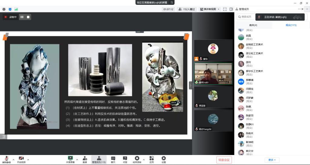 2022年11月11日下午,建筑与艺术设计学院工艺美术专业学术大讲堂(第一季)系列讲座第四场顺利进行,主讲嘉宾姜波教授以“时代与视觉一一中国当代陶瓷艺术的审美品格”为主题展开本次线上讲座。