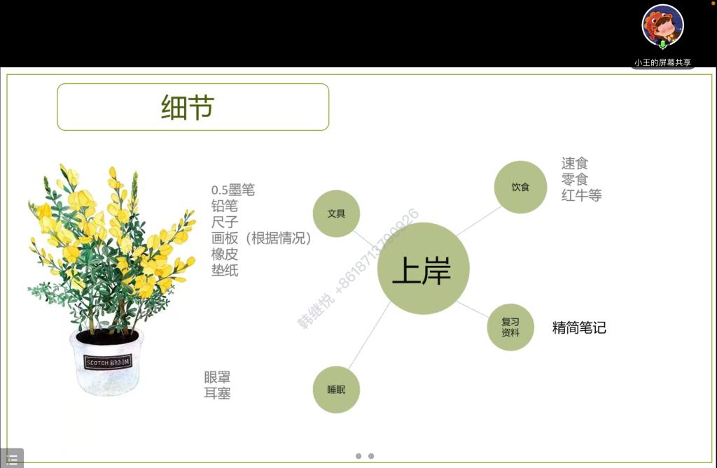 首先由2018级王珀姸同学分享自己的学习经验和生活中的时间规划,去年她因英语落后国家线5分未能进入理想的学校,今年重整旗鼓,决定二战。她结合自身经历告诉我们,备战考研一定要有计划、有思考的去复习。通过半个多小时的PPT展示从公共课备考,专业课及快题技巧,身体和心理素质,考试前的准备注意事项等四个方面进行讲述,干货满满的分享给大家最后还向学弟学妹们强调了英语学习的重要性,要想取得高分必须多去积累,多读多背多写。王同学用最后一句话与大家共勉学习是为了解放,但是坚持就是胜利!