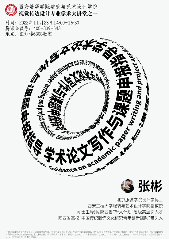 2022年11月23日,视觉传达设计专业邀请西安工程大学副教授张彬博士,就“学术论文写作与课题申报指导”等问题开展学术讲座。