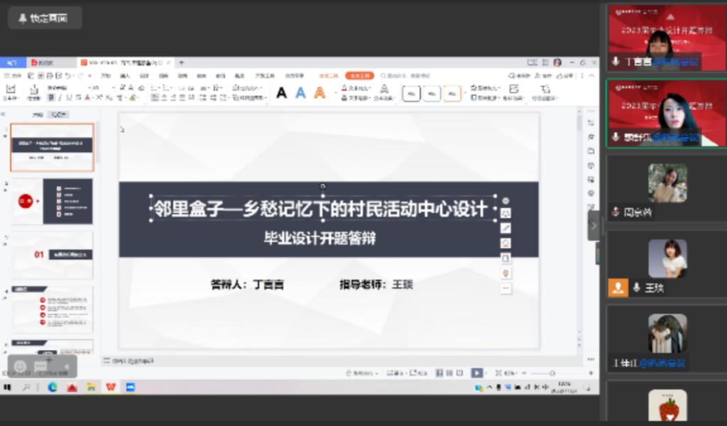 根据建筑与艺术设计学院对疫情防控期间做好本科生毕业设计开题答辩的相关要求,建筑学专业于11月27日上午9:00开展了2023届建筑学专业毕业设计开题答辩,本次答辩在腾讯会议线上平台通过PPT展示、视频共享等方式进行。答辩组长由王琰老师担任,魏舒乐、戴煜轩、赵艺阳、杨雪老师担任答辩评委,周京蓉老师担任答辩秘书,参加答辩学生共6名。