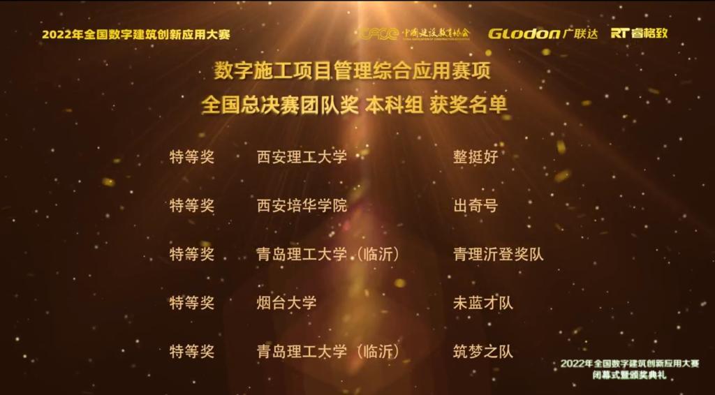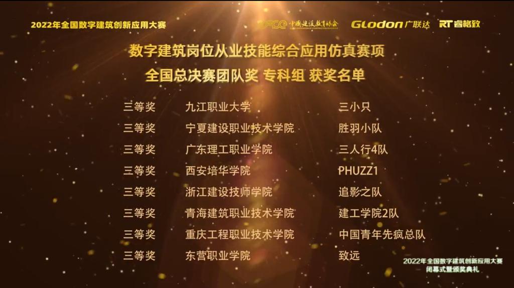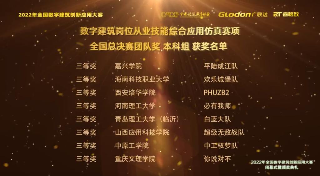 刚刚结束的周末,2022年全国数字建筑创新应用大赛线上闭幕式暨颁奖典礼成功落幕。我院工程造价专业组队参赛并取得优异成绩。