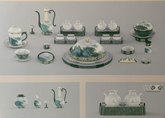 火凤凰为全运会设计的宴会瓷(金碧山水)