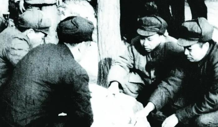 宜瓦战役中,西北野战军司令员兼政治委员彭德怀(右一)与副司令员张宗逊(左一)、赵寿山(左二)、政治部主任甘泗淇(右二)一起研究作战方案