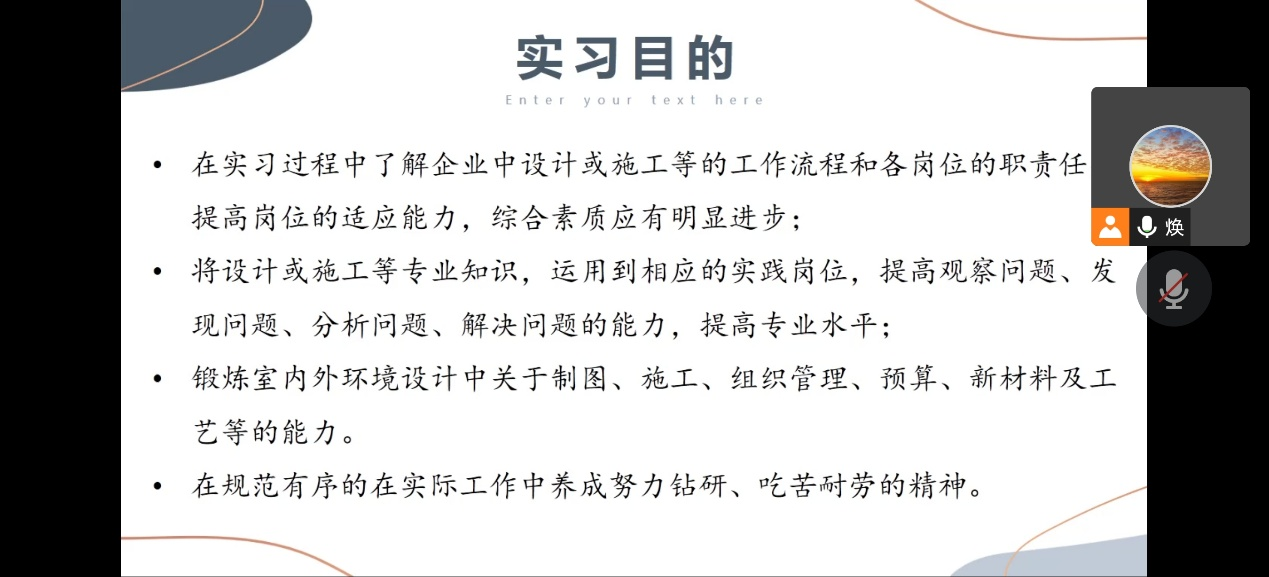 为进一步提高应用型人才培养质量,确保2023届毕业实习工作正常有序开展,切实提高学生的实践能力和专业水平,依据《西安培华学院实践教学管理办法》《西安培华学院毕业实习管理办法》等文件精神和要求,我院环境设计专业在线上召开2023届本科毕业实习动员会。本次动员大会由环境设计专业2023届全体毕业生及相关指导教师参加。