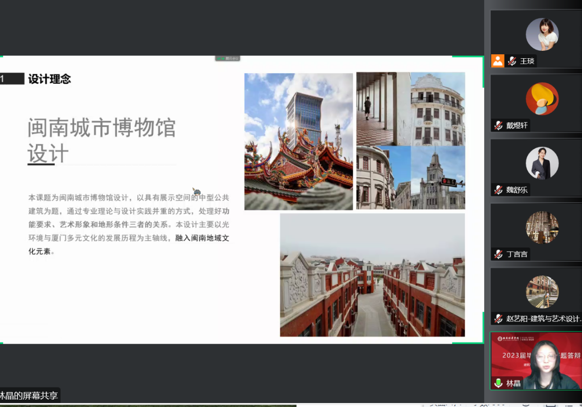 根据建筑与艺术设计学院对疫情防控期间做好本科生毕业设计开题答辩的相关要求,建筑学专业于11月27日上午9:00开展了2023届建筑学专业毕业设计开题答辩,本次答辩在腾讯会议线上平台通过PPT展示、视频共享等方式进行。答辩组长由王琰老师担任,魏舒乐、戴煜轩、赵艺阳、杨雪老师担任答辩评委,周京蓉老师担任答辩秘书,参加答辩学生共6名。