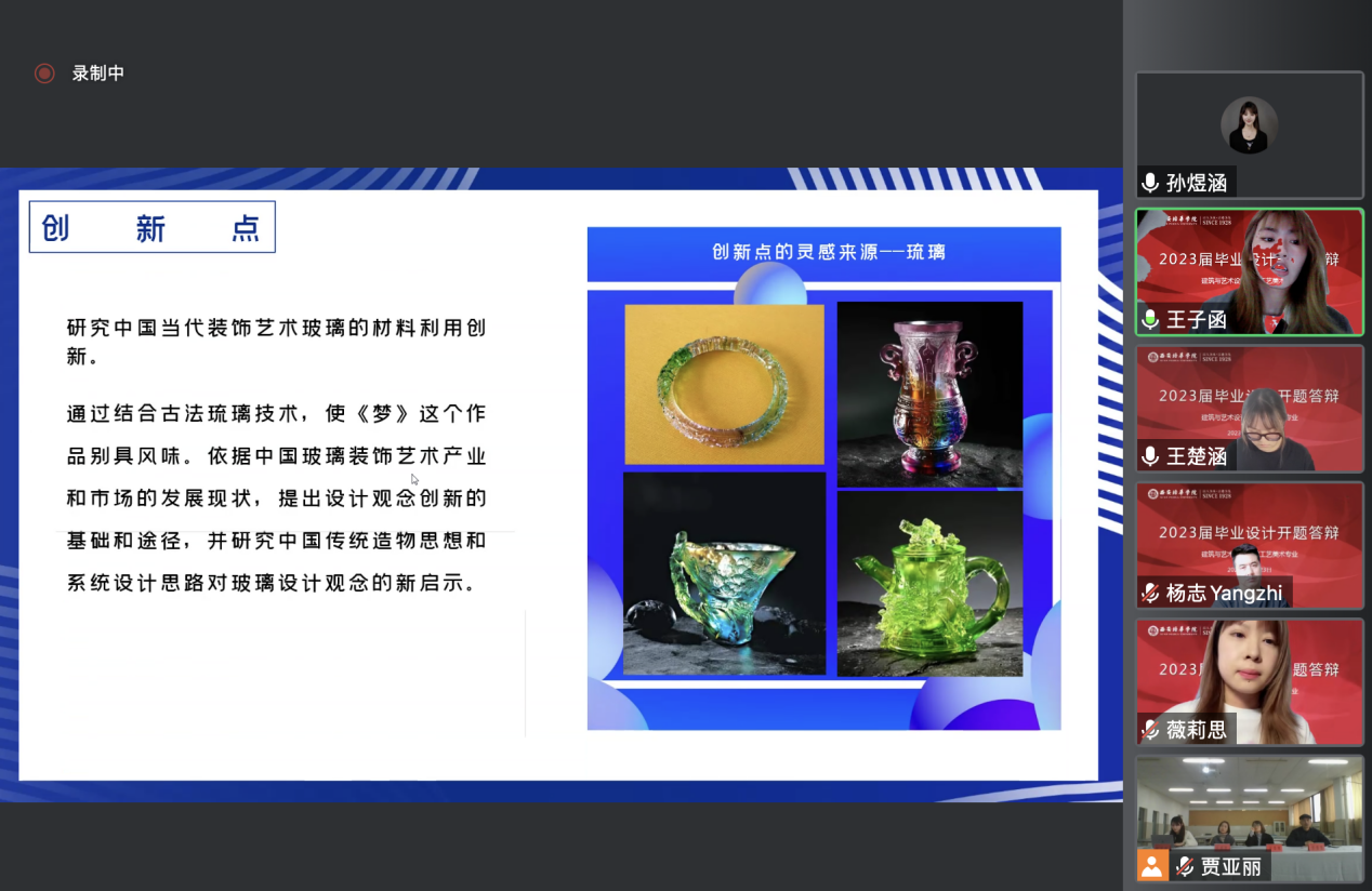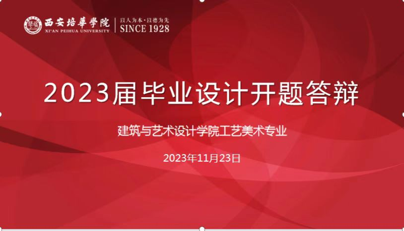 答辩开始,工艺美术专业带头人杨志副教授就此次答辩流程作了简要说明,提醒学生在答辩过程中注意语言表述,认真记录,以便进一步完善开题报告。开题答辩分为学生陈述、老师点评与提问、学生回答问题等环节。学生依次对设计的选题背景、研究目的和意义、研究内容、预期成果和创新点进行阐述汇报,答辩陈述结束后,老师就目前开题情况作出点评提问,指出学生需改进的内容以及下一步计划。同学认真记录各位老师意见,继续优化作品方案,跟进论文框架。