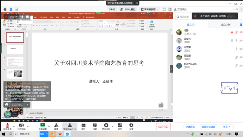 2022年11月17日上午,建筑与艺术设计学院工艺美术专业学术大讲堂(第一季)系列讲座第六场顺利进行,主讲嘉宾孟福伟教授以“关于对四川美术学院陶艺教育的思考”为主题展开本次线上讲座。
