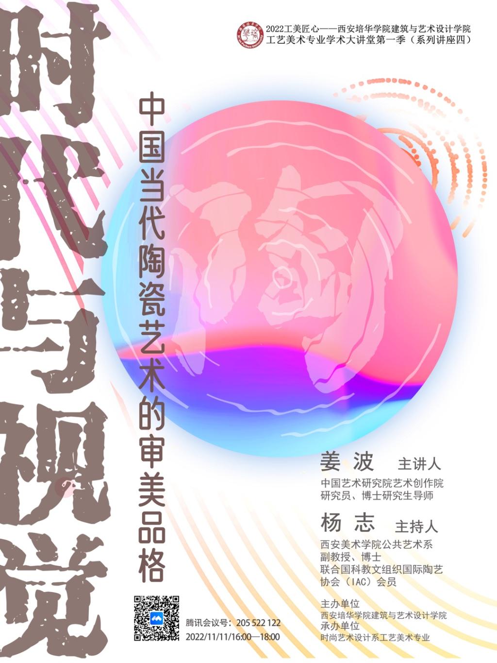 2022年11月11日下午,建筑与艺术设计学院工艺美术专业学术大讲堂(第一季)系列讲座第四场顺利进行,主讲嘉宾姜波教授以“时代与视觉一一中国当代陶瓷艺术的审美品格”为主题展开本次线上讲座。