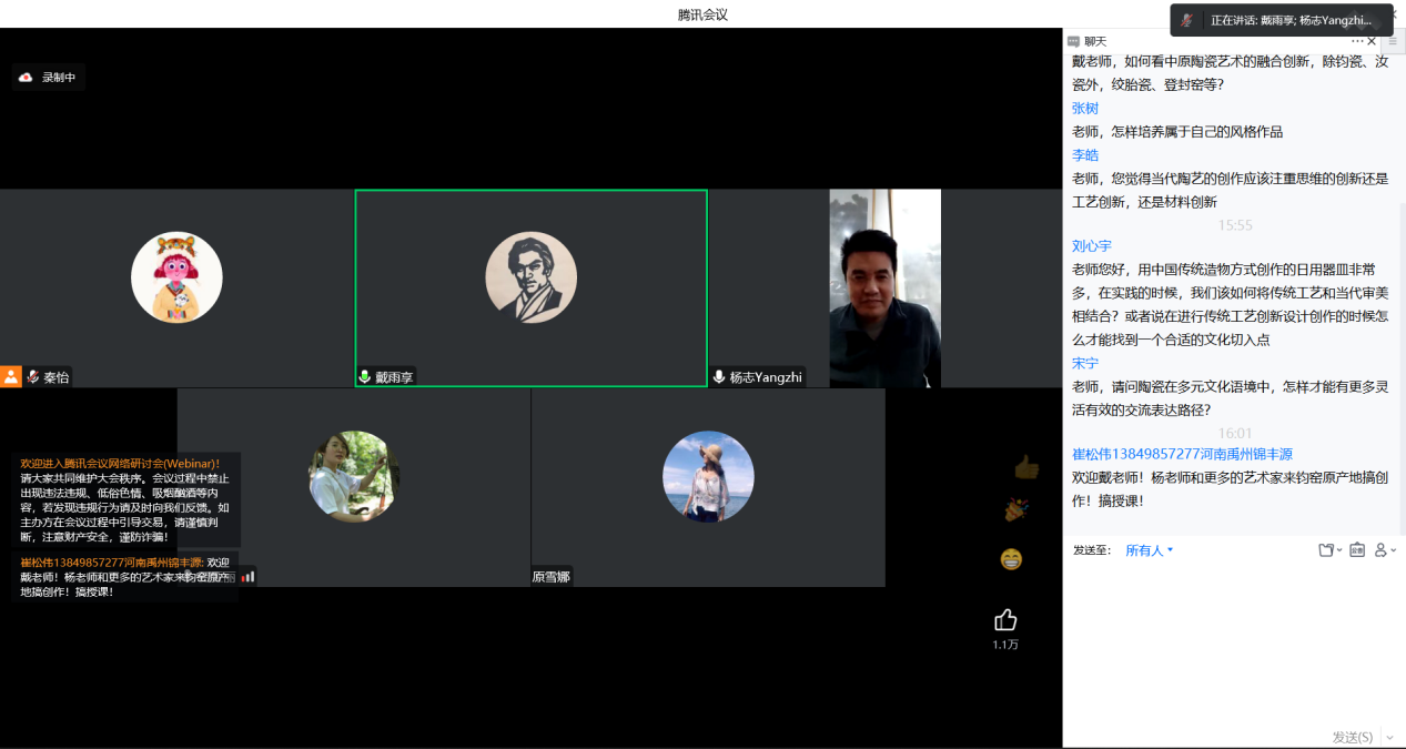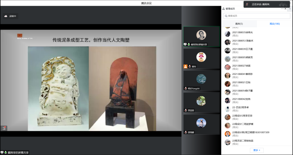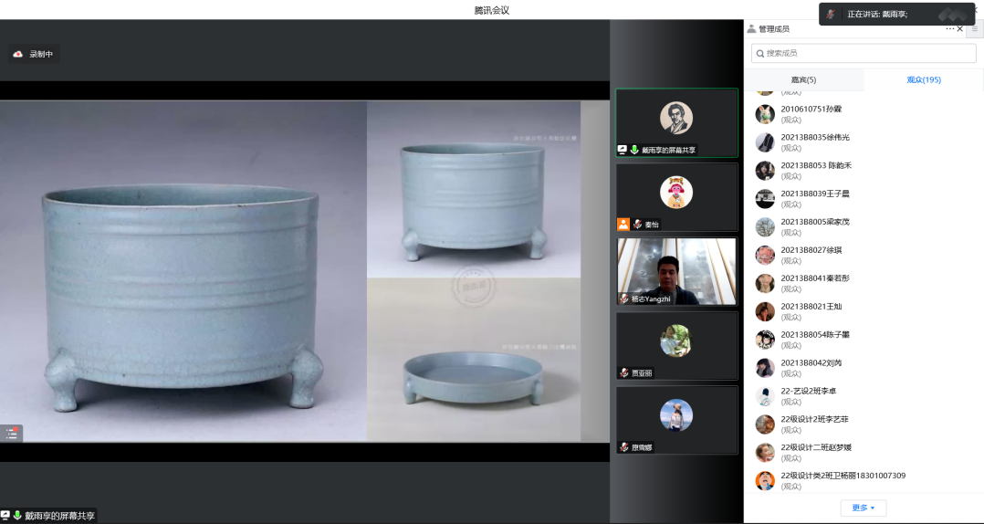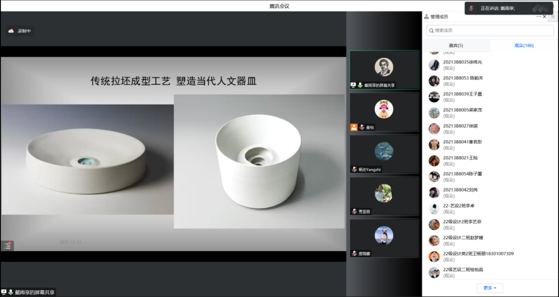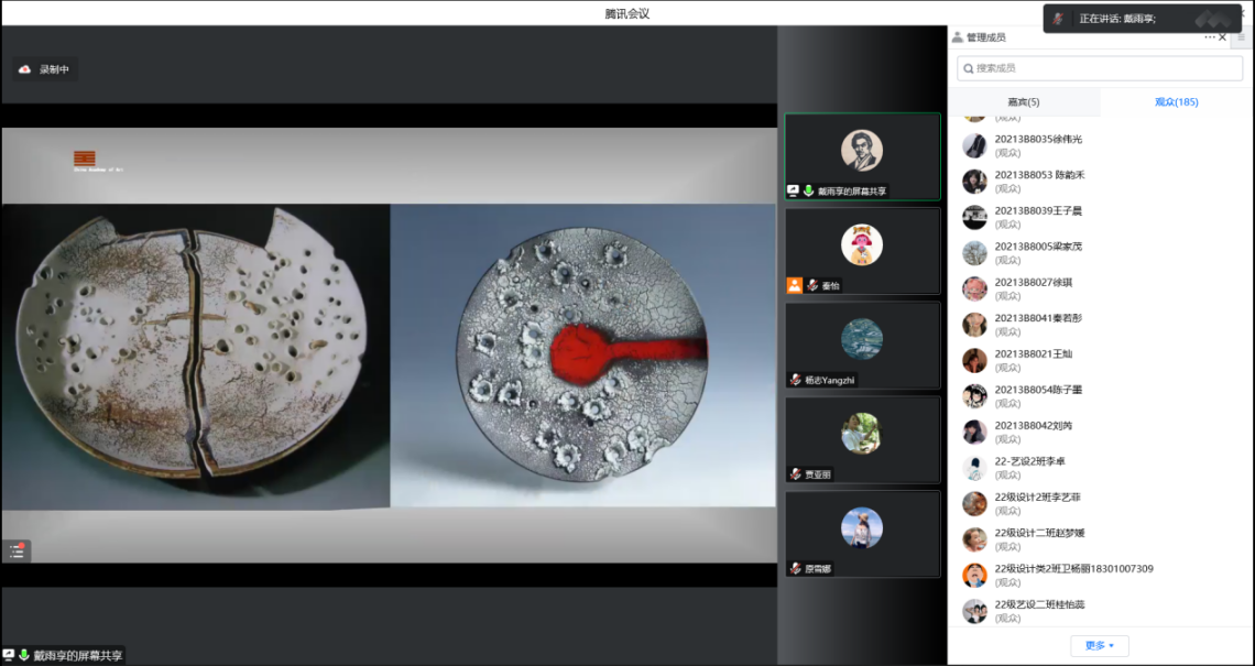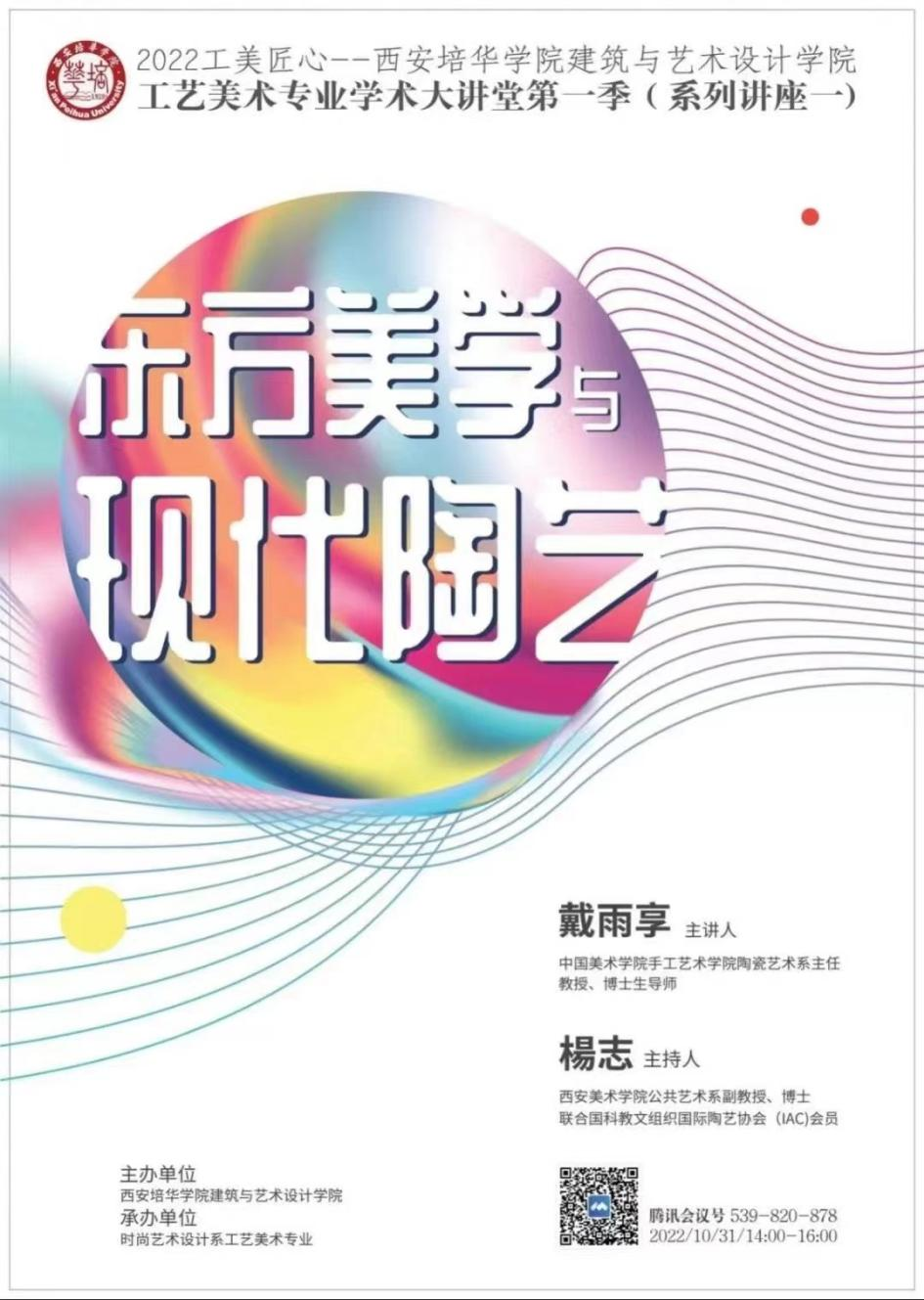 2022年10月31日下午,建筑与艺术设计学院工艺美术专业学术大讲堂(第一季)系列讲座第一场顺利进行,邀请中国美术学院手工艺术学院陶瓷艺术系主任、教授、博士生导师--戴雨享教授举办了“东方美学与现代陶艺”主题讲座,因疫情原因,讲座为线上讲座。