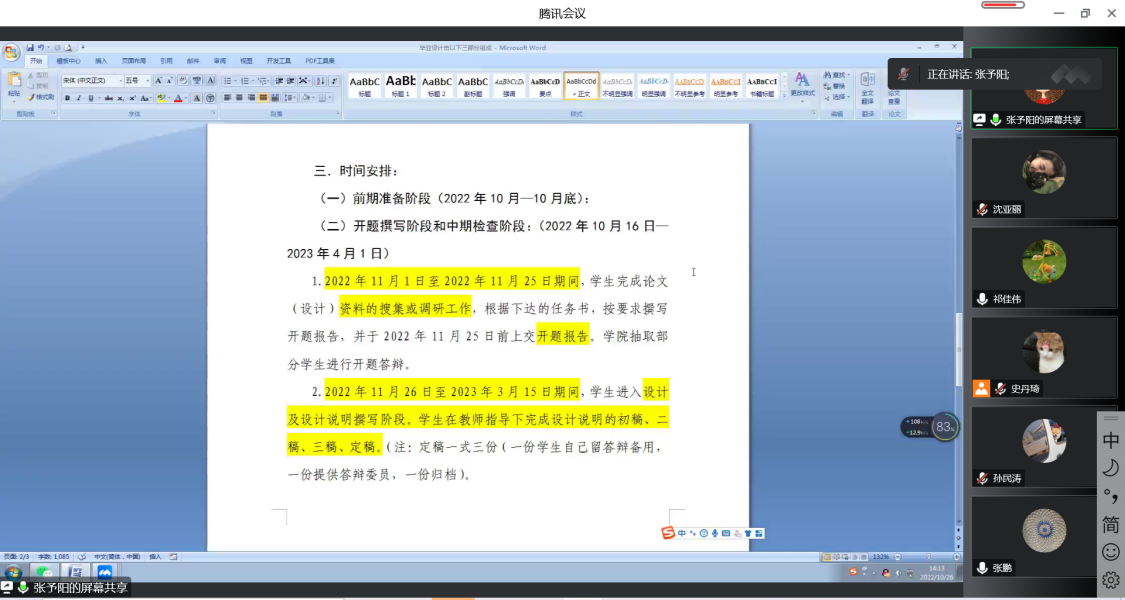 会上,张予阳老师对2023届毕业设计主题方向及毕业设计管理要求等做了详细介绍,同时指出,同学们要将自己所学的理论知识和专业技能充分结合,才能做好毕业设计。希望同学们发散思维,开拓创新,并且及时与指导老师进行沟通,从中获得指导,毕业设计严禁抄袭,要求原创。其次,张予阳老师向我们详细地介绍毕业设计流程安排和重要时间节点的任务安排。