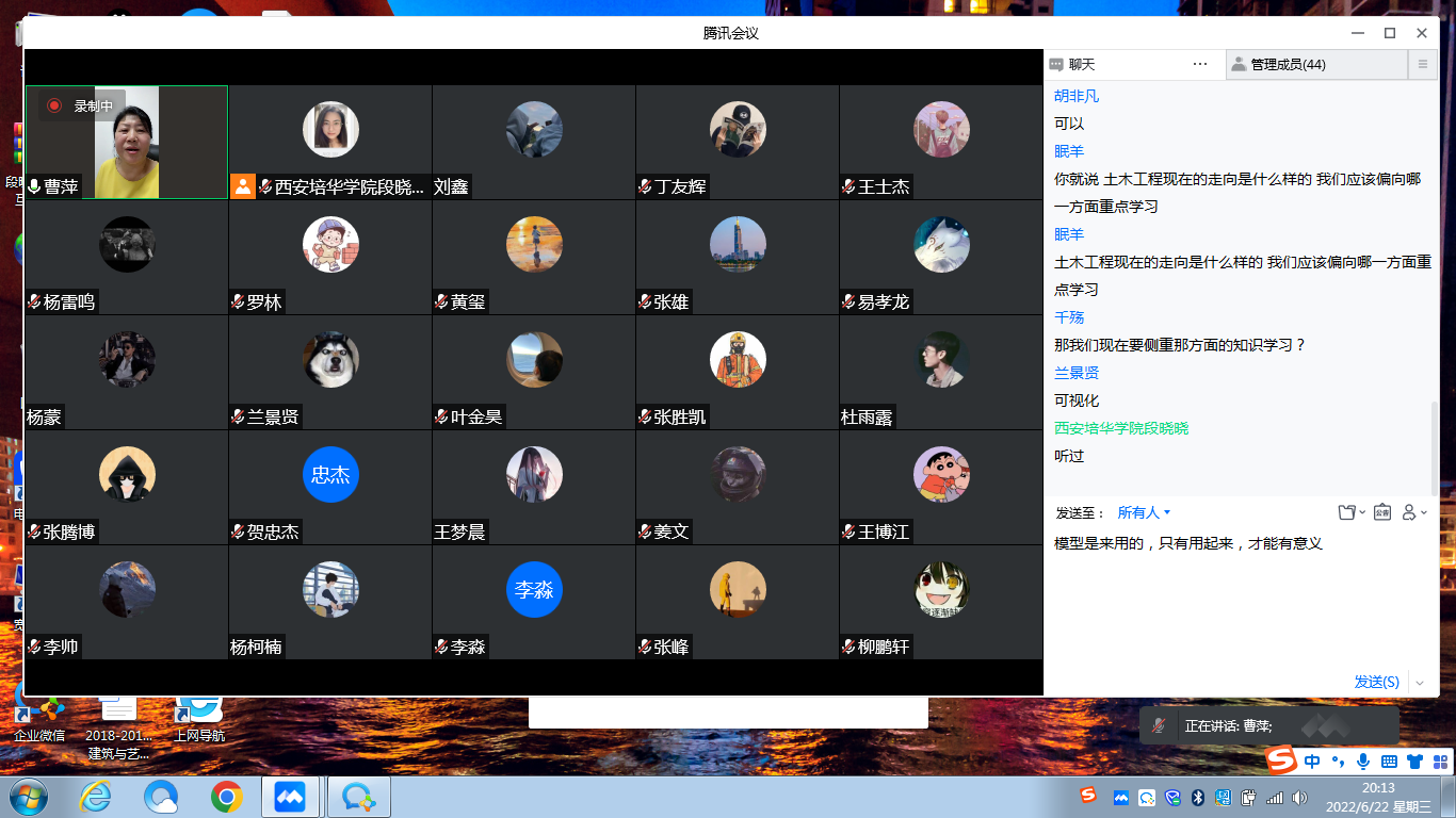 而后,曹萍老师又介绍了土木工程专业未来的两个房展方向:建筑全寿命周期咨询、碳中和等。用省一建、中建安装华西公司等工程实例对BIM技术的应用进行了介绍。让同学们对BIM技术与全寿命周期咨询、和碳中和的关系,有了一定的认识。