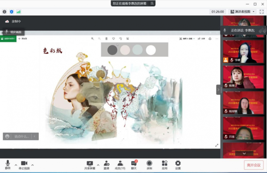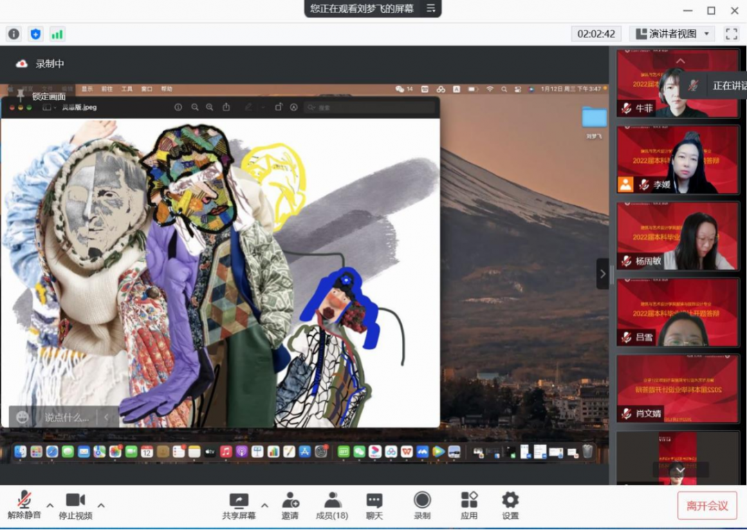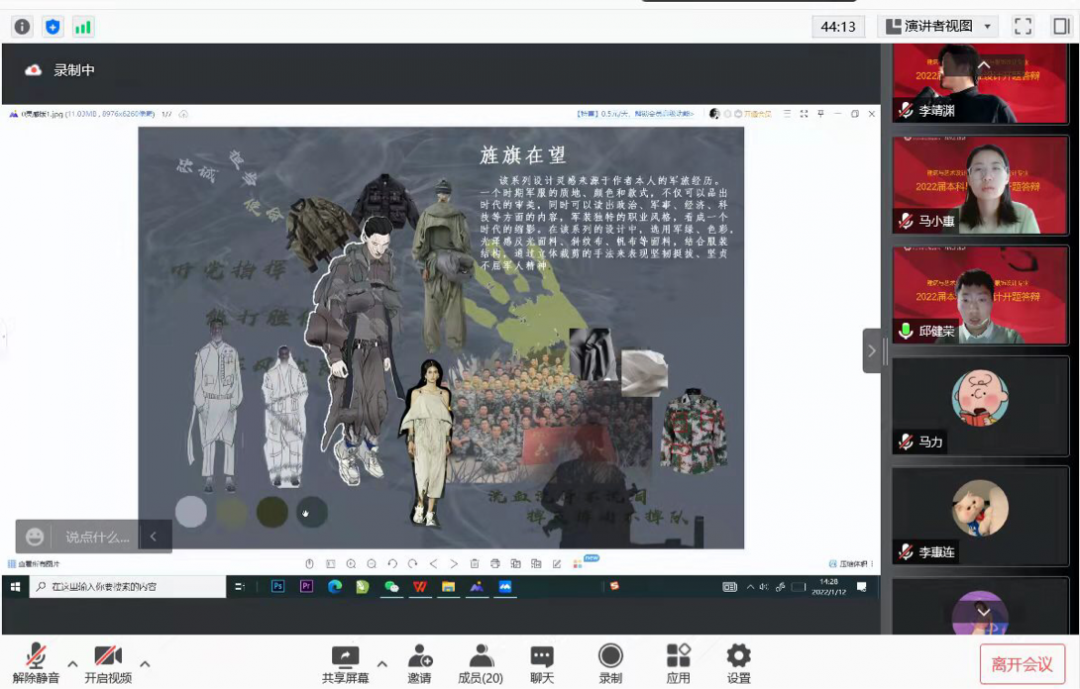 2022年1月12日14:00-17:00,服装与服饰设计专业在线上平台组织开展了2022届毕业设计开题答辩工作。服装与服饰设计专业带头人李媛教授担任答辩组组长,专业教师杨周敏、雷洁、牛菲、吕雪担任答辩评委,专业教师牛菲担任答辩秘书,史晓眉老师担任本次答辩的督导。服装与服饰设计专业从本专业2022届学生中抽取7位同学参加线上答辩,并作为示范答辩。