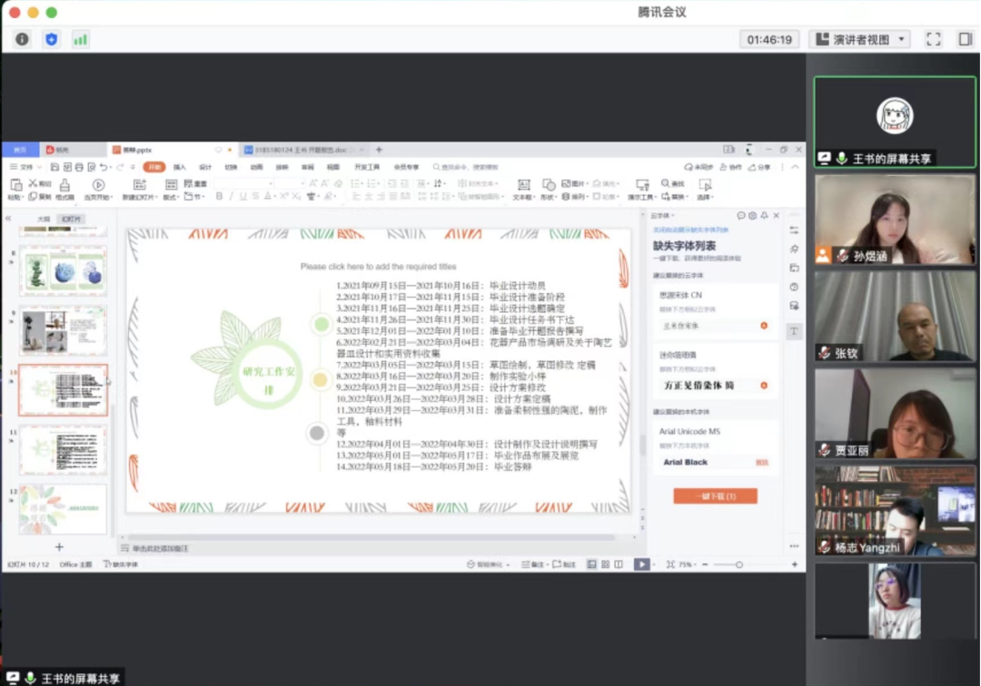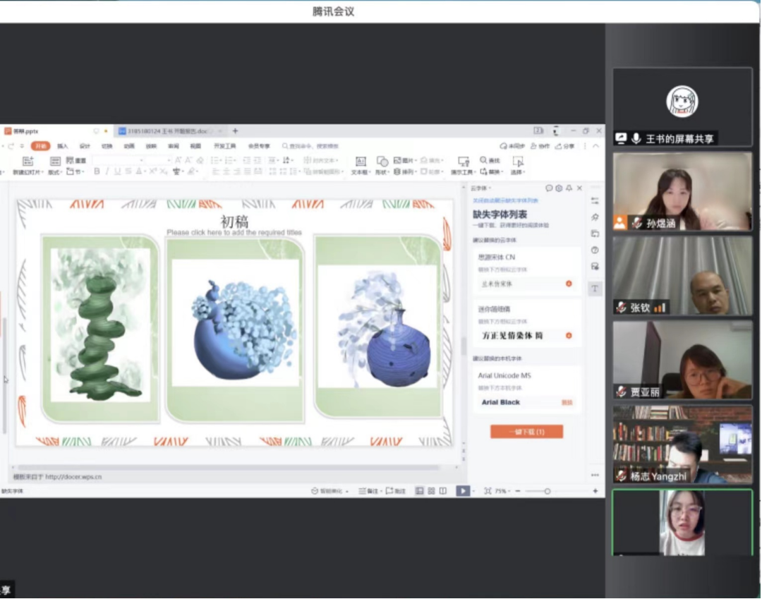 2022年1月7日14:00至17:00,工艺美术专业利用线上平台组织开展了2022届毕业设计开题答辩工作。工艺美术专业带头人杨志副教授担任答辩组组长、专业负责人贾亚丽老师、专业教师原雪娜老师、张钦老师担任答辩评委,孙煜涵老师任答辩秘书。本专业按照各指导教师指导的学生数量抽取不低于10%比例的学生参加线上答辩,其他学生以审阅开题报告的形式进行开题。