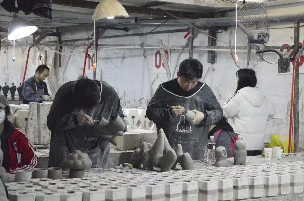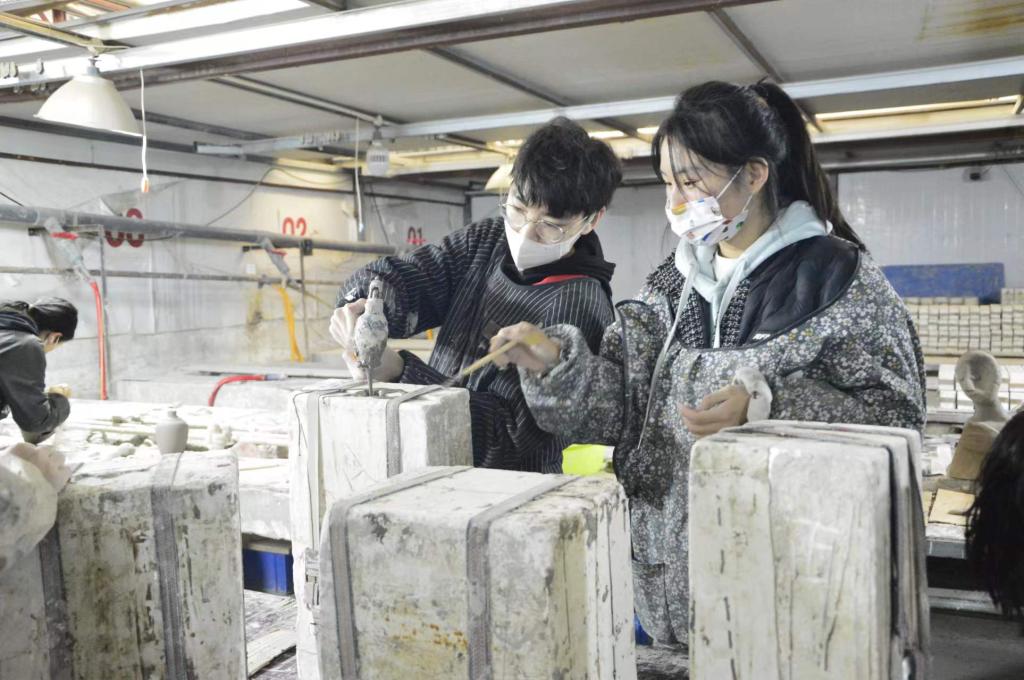 工艺美术专业教师原雪娜,秦怡与企业导师梁晓慧共同在现场指导学生进行陶艺创作。