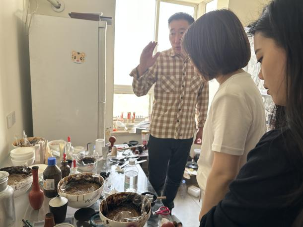 在参观张教授工作室时,张教授分享日用漆器创作经验,以木胎器碗为例,讲解了通过多次擦漆,既突出原木的肌理又耐高温,体现出大漆不可替代的性能优势,了解张教授寻找天然大漆的曲折故事。贾亚丽老师从专业建设、课程设置,同学们从漆的特性、材料以及创作过程中遇到的问题等方面同时与张志刚老师进行了深度交流。
