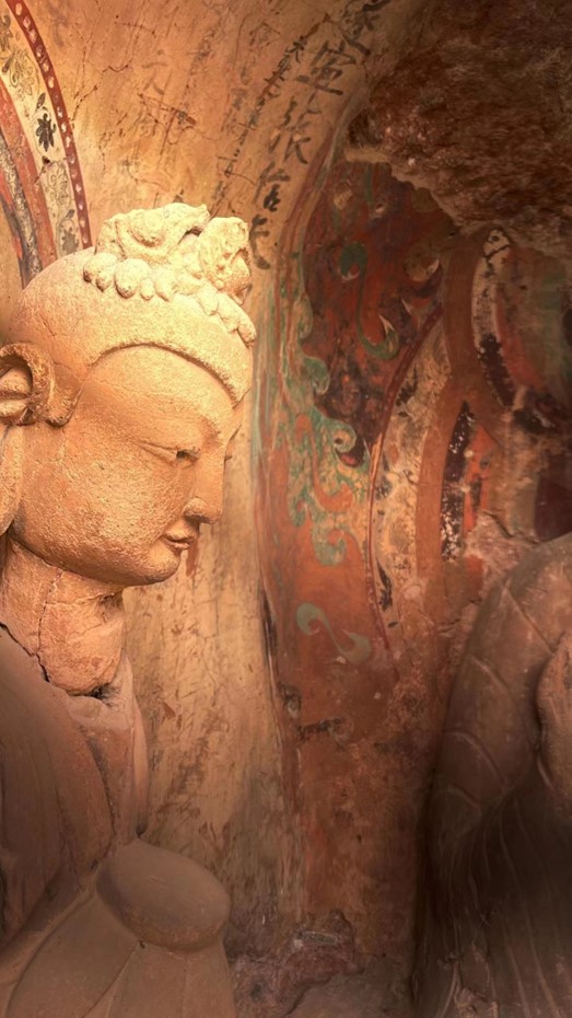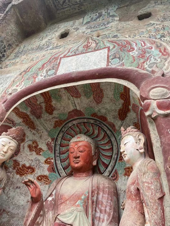 最后一站,教师们参观考察了天水市麦积山石窟,麦积山石窟受阴湿多雨等自然因素影响,壁画保存较少,但价值极高,题材丰富,构思精妙、技法娴熟。主要包括说法、本生、经变、千佛、礼佛等内容。其保存的造像以泥塑为主,历代连续不断,全面展示了古代泥塑发展演变的过程。如北魏前期的魁伟雄健、北魏后期的秀骨清像、西魏的俊秀清朗、北周的珠圆玉润、隋唐的饱满圆润、两宋的写实求变等。是研究雕塑史、美术史的重要资料,有“东方雕塑陈列馆”的美誉。