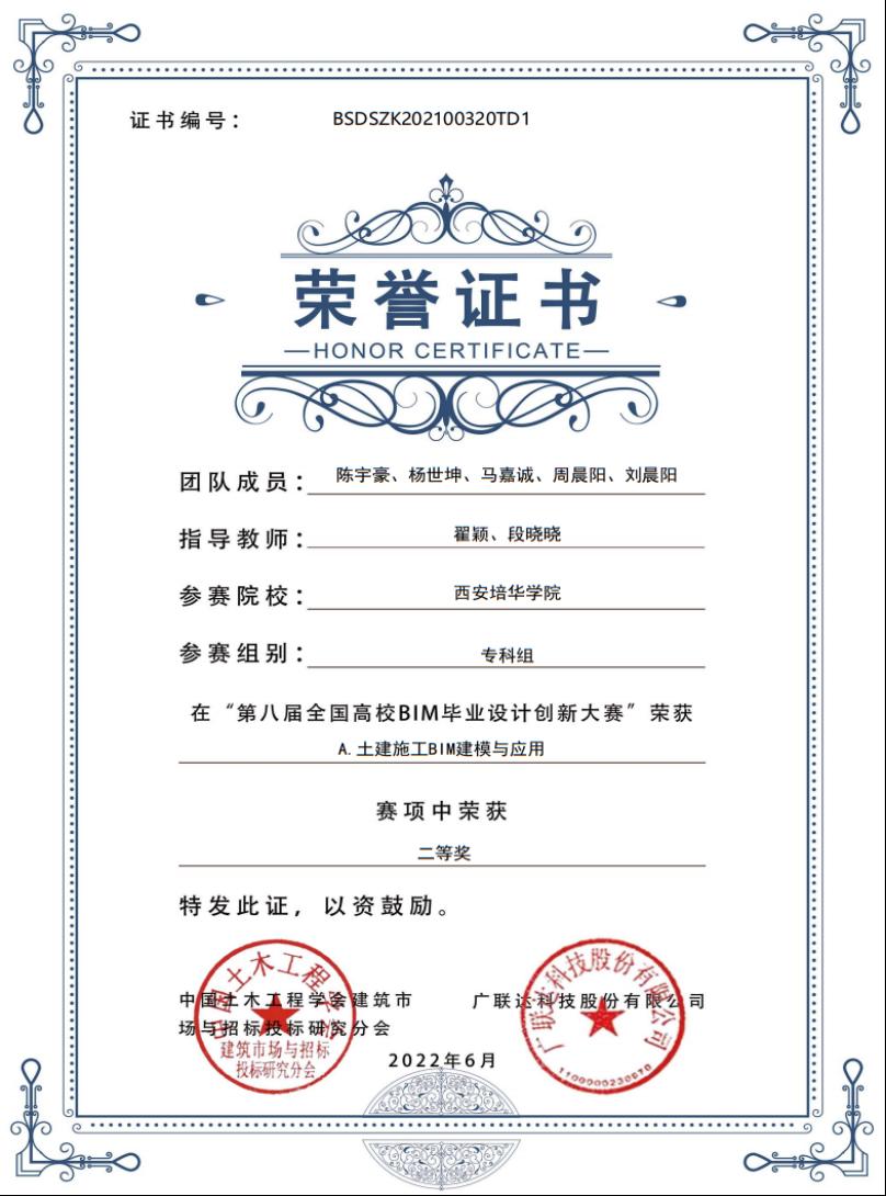 为推进土木建筑类专业BIM教学开展,推动BIM人才培养,将竞赛与有关课程、技能内涵有机结合,学生技能与素养相互结合,培养学生的协作精神。经过半年多的精心组织和指导,克服疫情的重重障碍,师生们共同努力,在第八届全国高校BIM毕业设计创新大赛中斩获二等奖1项,三等奖3项,优秀奖2项。高瑞欣、段晓晓、翟颖、宋胜男、赵冉、王淑芳、杨锦7名教师获本次赛事的“优秀指导老师”荣誉称号。