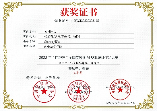 为全面贯彻《中共中央关于制定国民经济和社会发展第十四个五年规划和二〇二三年远景目标的建议》,加快培养创新性人才,推动高等教育高质量发展,激发人才活力与创造激情,中国建设教育协会举办了2022年“鲁班杯”全国高校BIM毕业设计作品大赛。建筑与艺术设计学院高瑞欣、段晓晓、翟颖老师组织学生积极参赛。在长达半年的备赛过程中,学生团结协作、细致认真,最终斩获BIM建模赛项房建组一、二、三等奖各一项,BIM建模市政组二、三等奖各一项,高瑞欣、段晓晓、翟颖老师获得优秀指导教师。